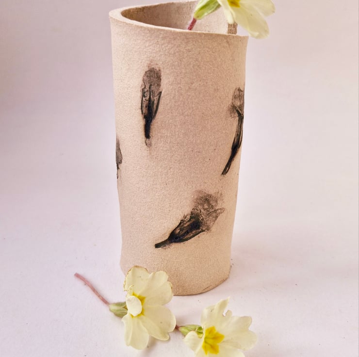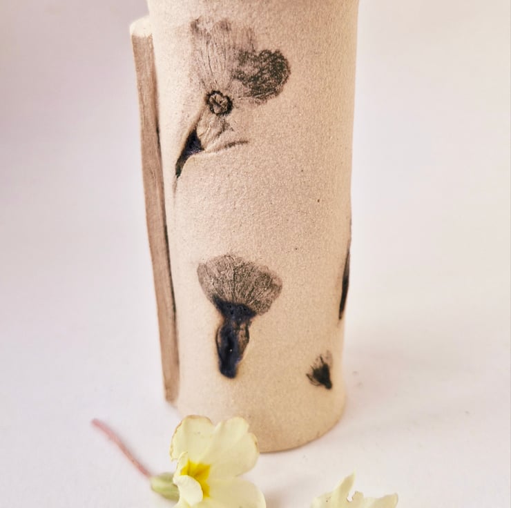 This handcrafted ceramic vase captures the essence of the season, decorated with primrose flowers.