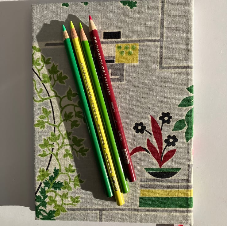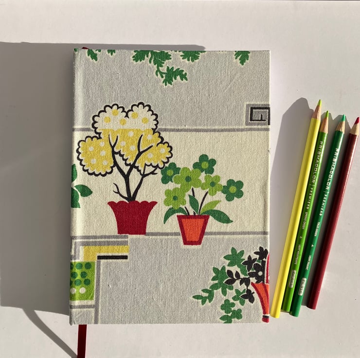 Made with care from high quality 130gsm smooth white paper which is hand cut, folded, stitched and bound, and then covered with genuine vintage cotton barkcloth fabric from the early 1950's.