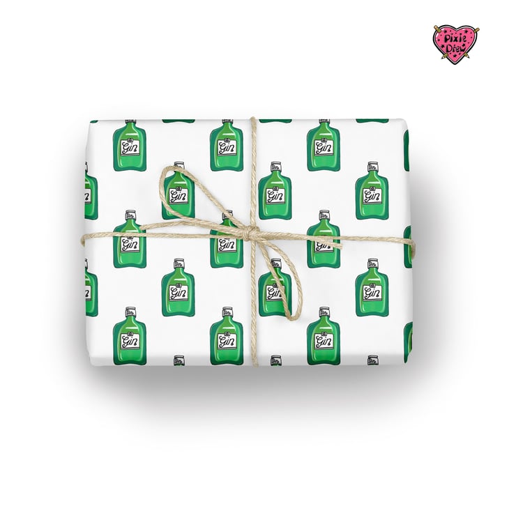 Green gin bottle luxury wrapping paper featuring my hand drawn designs in a repeat pattern and printed on my large format printer, to order in my home studio in Sheffield.