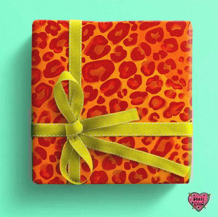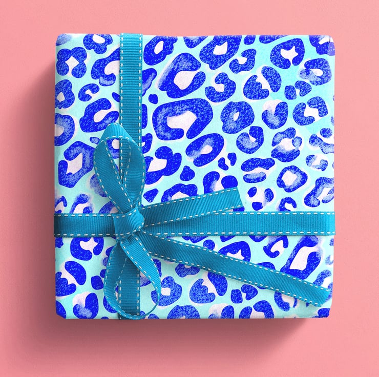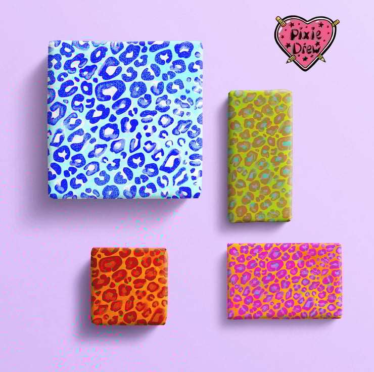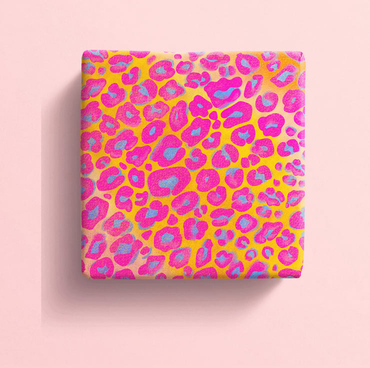 Leopard print wrapping paper in blue, orange, pink or green