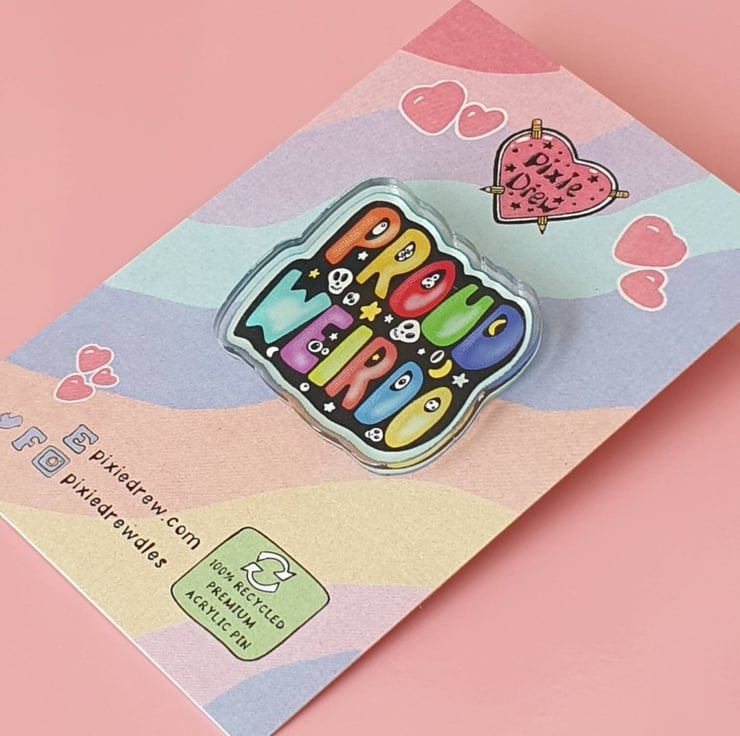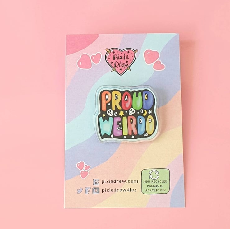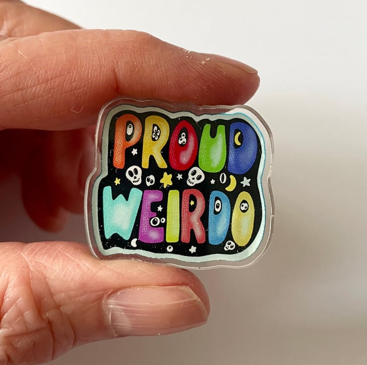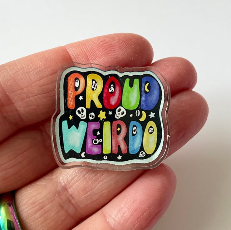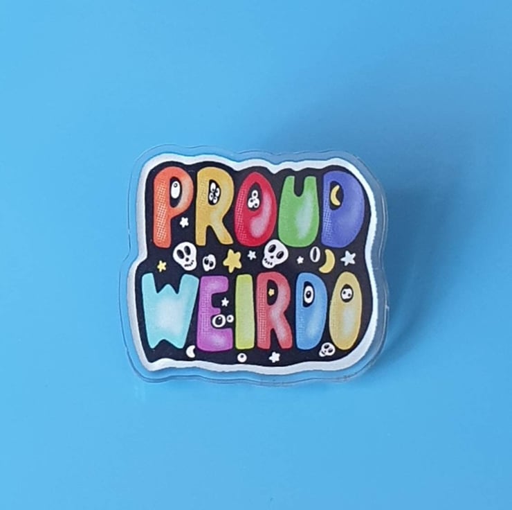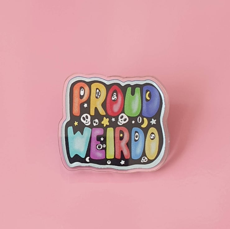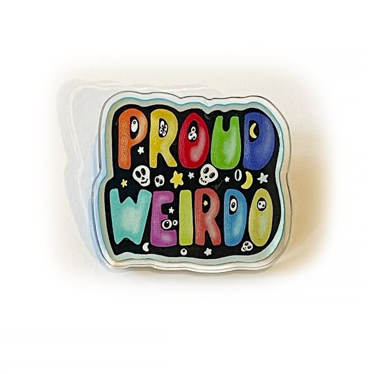 Proud weirdo hand typography lettering with skulls, stars and eyeballs 100% recycled acrylic pin.