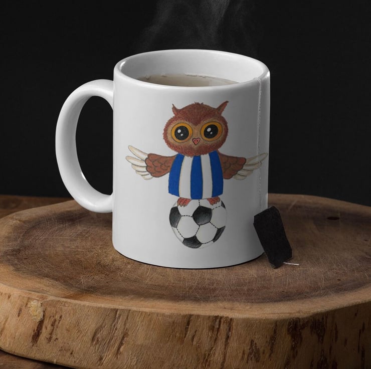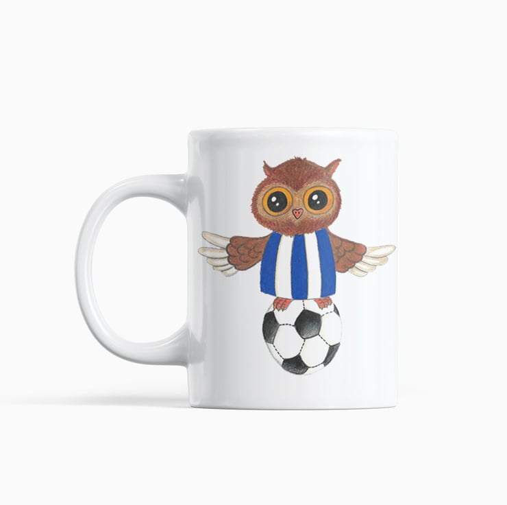 Ozzy owl mug with my owl illustration dressed in a blue and white jersey and balanced on a football.