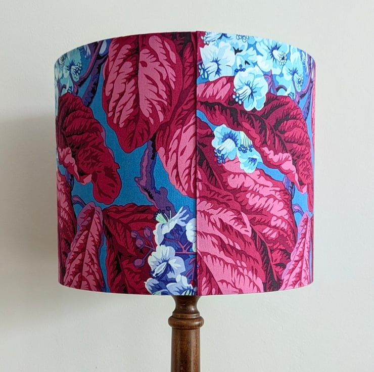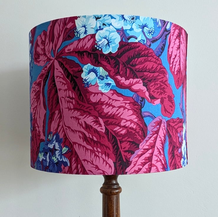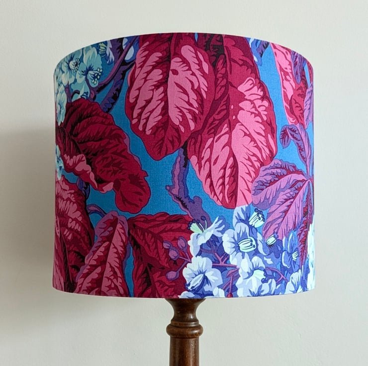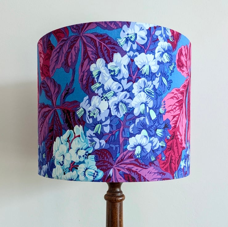 This vibrant lampshade features Horse Chestnut fabric in blues, pinks, and purples.