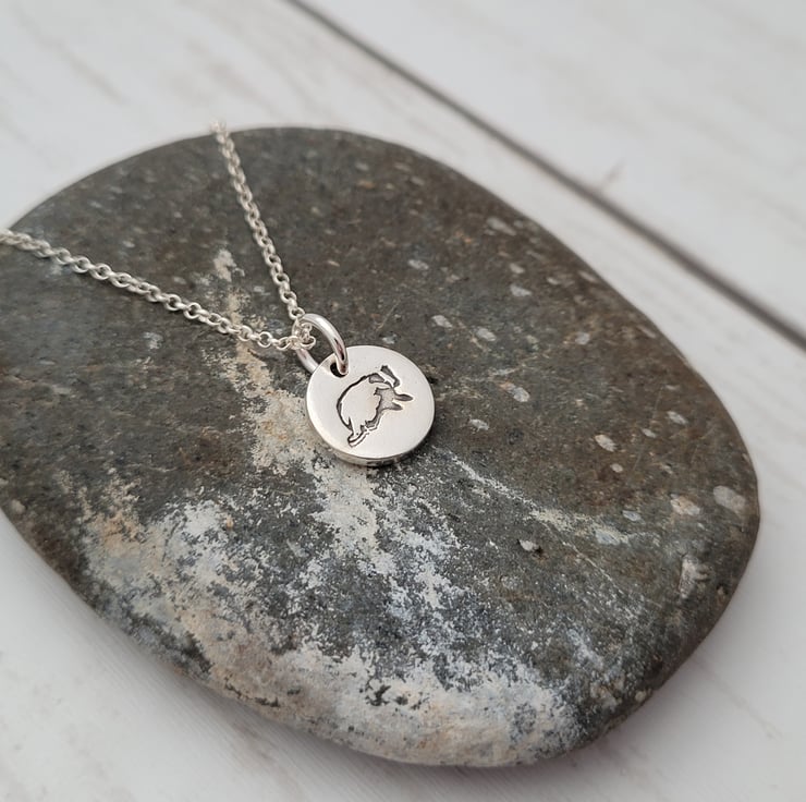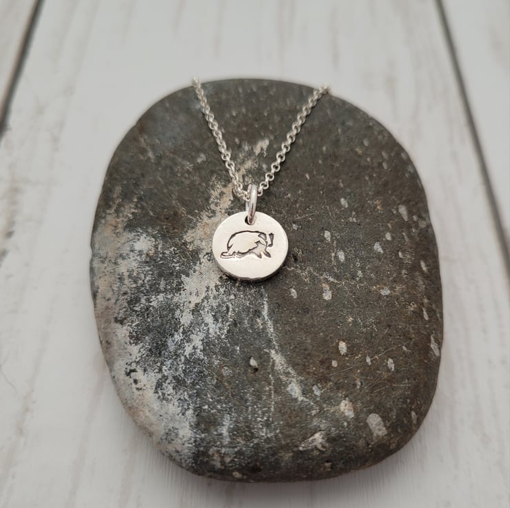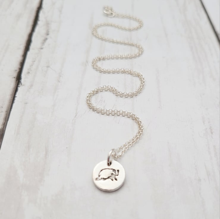 This perfectly imperfect tiny badger pendant features my unique badger design imprinted in sterling silver.