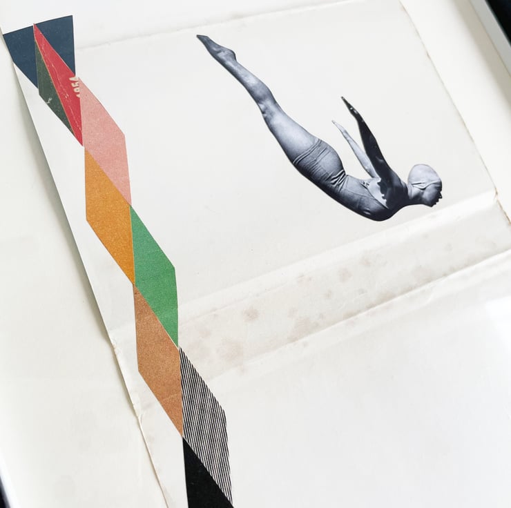 This beautiful perfectly imperfect geometric portrait was made with vintage papers on an old dust jacket from a small book.