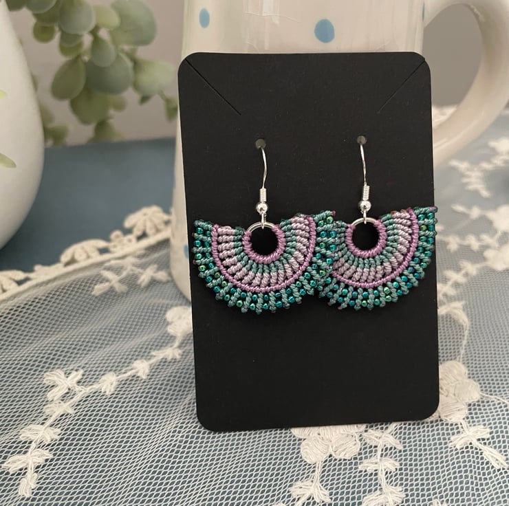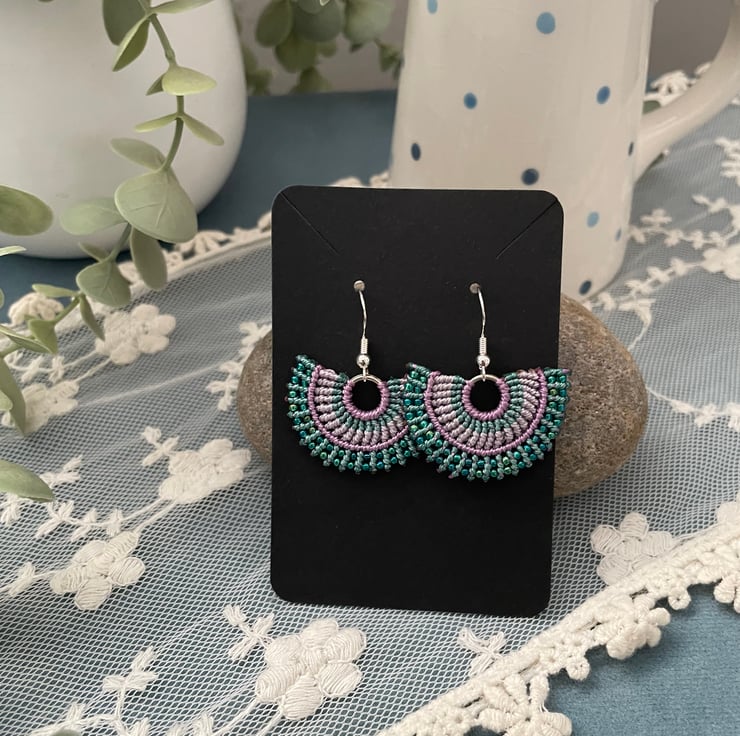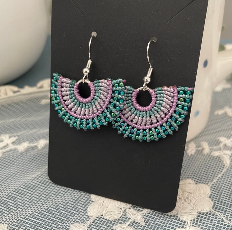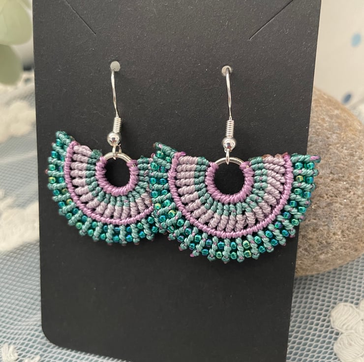 Designed and created by me in my Kent studio in pretty colors of lilac and green interwoven with tiny glass seed beads and using unbreakable c-lon macrame thread knotted into the intricate design.
