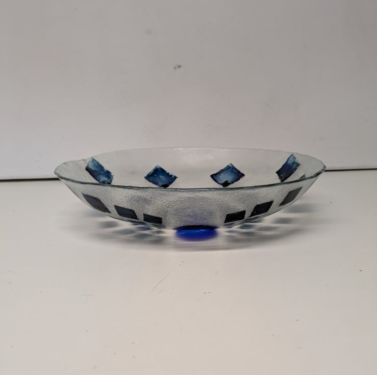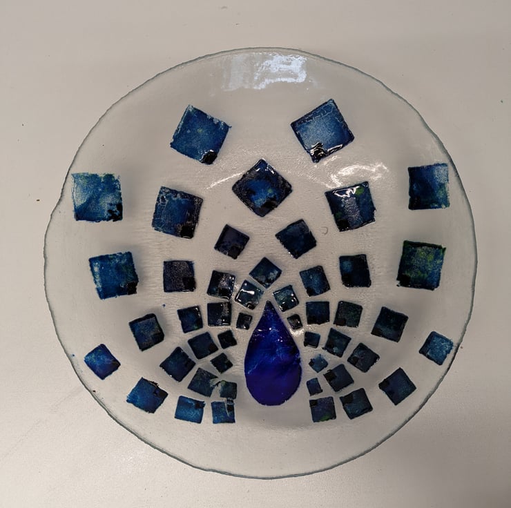 30 cm diameter fused glass bowl with a beautiful blue and green geometric peacock design. Can be used for keeping trinkets or display.