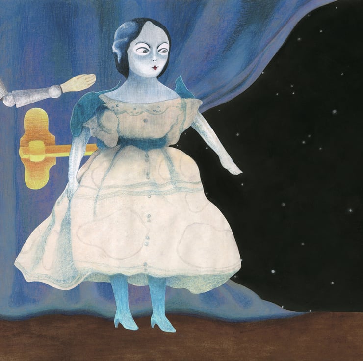 I created this piece using chalk pastels and pencils, cutting and collaging the drawings together for more impact. It illustrates is a scene from the classic "The Velveteen Rabbit" story by Margery Williams, which was set in the 1920's. The 'modern' mechanical toys make the little rabbit feel very unwelcome in the nursery. The lighting and the curtain are very theatrical, as is the dramatic crop of the image.