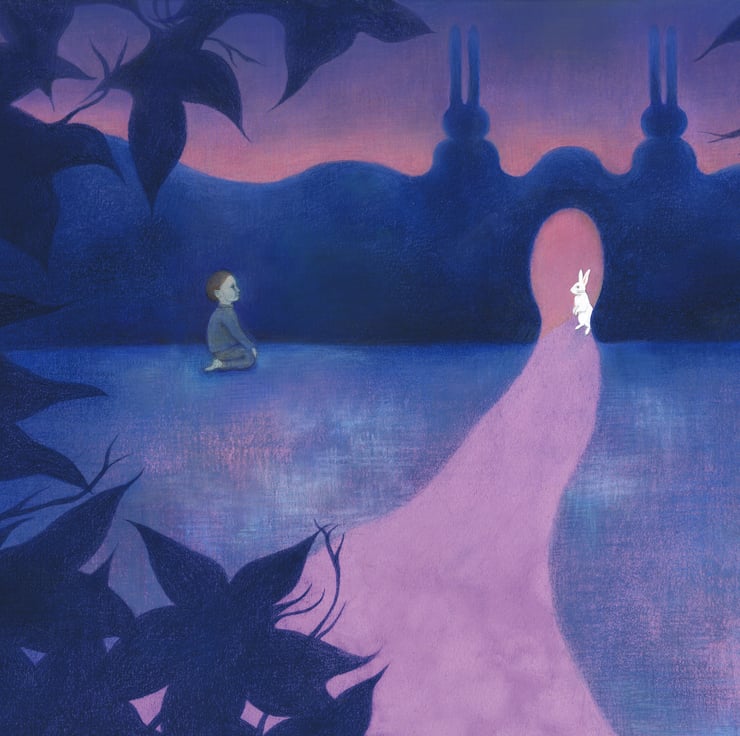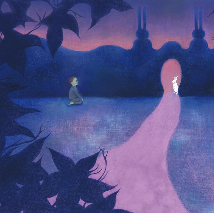 This illustration depicts the poignant final scene from "The Velveteen Rabbit" story by Margery Williams. The rabbit is returning to look at the boy who loved him and helped him to become "Real" (he was once his toy rabbit).