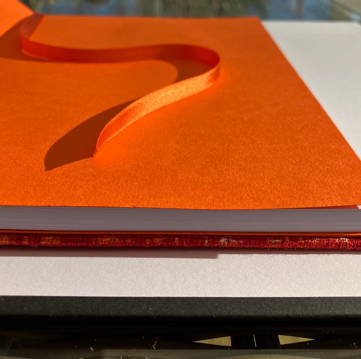 Each book I make includes a ribbon bookmark and coloured end-papers made from high quality Canford or Canson paper, hand picked to match one of the colours in the fabric design. This book has a stunning bright orange silk ribbon and matching Canford end papers.