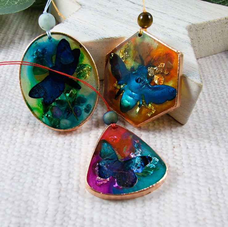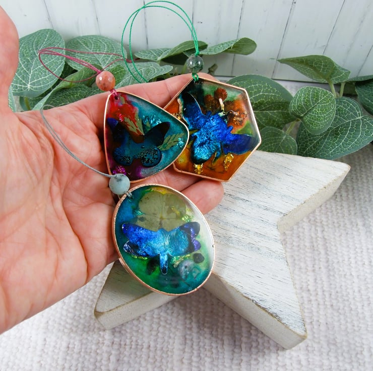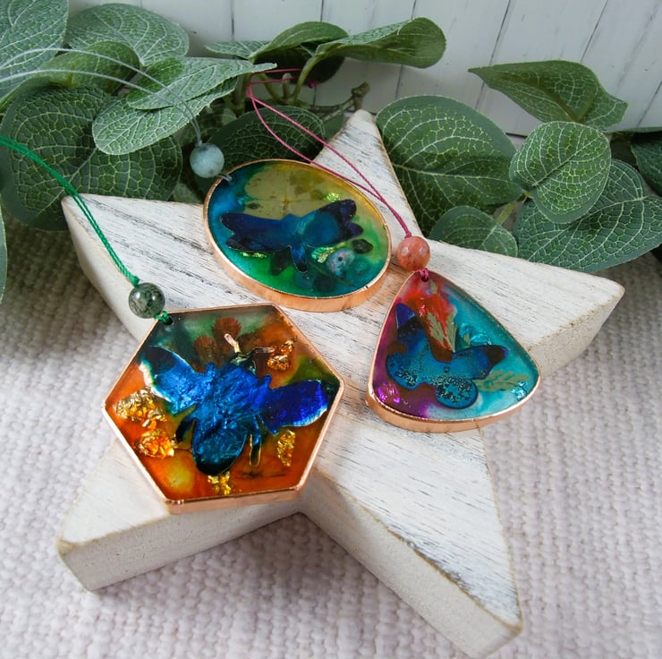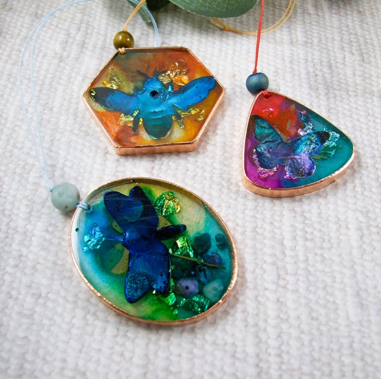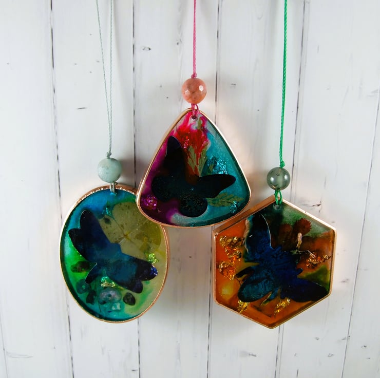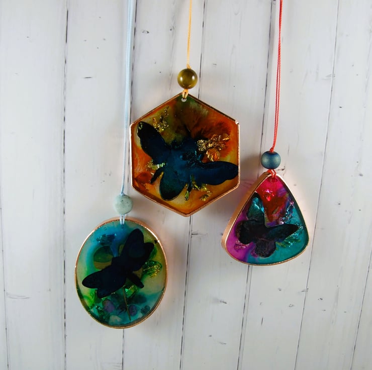 Set of three Hanging Decorations, a bee, a butterfly and a dragonfly. Unique handcrafted sun catchers with resin and metal leaf and hand painted inks. These were experimental pieces so I have included them in my sale and seconds section, this is reflective of the unpredictable nature of combining inks and resin.