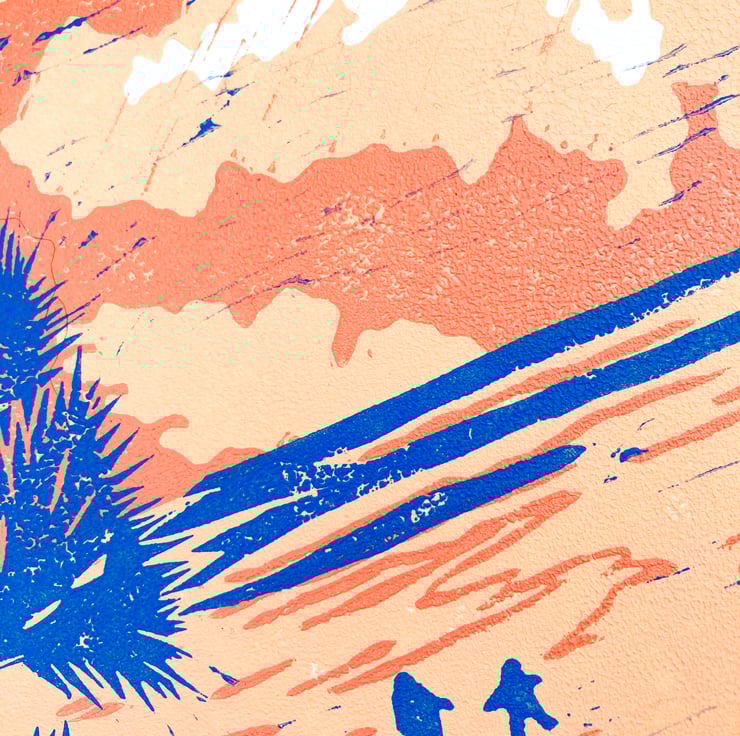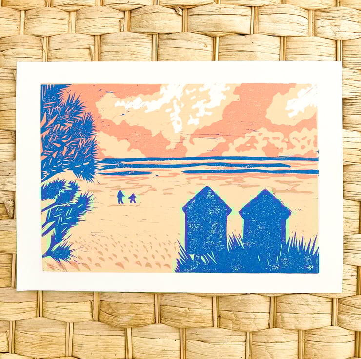 ‘Tranquil’ is a 3 layer Lino Print based on the Beach at Wells-Next-Sea. A Parent and Child are walking along a calm beach on a summers evening. The colours depict the evening light with the feel of a sunset.