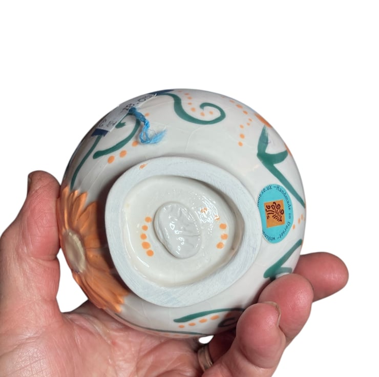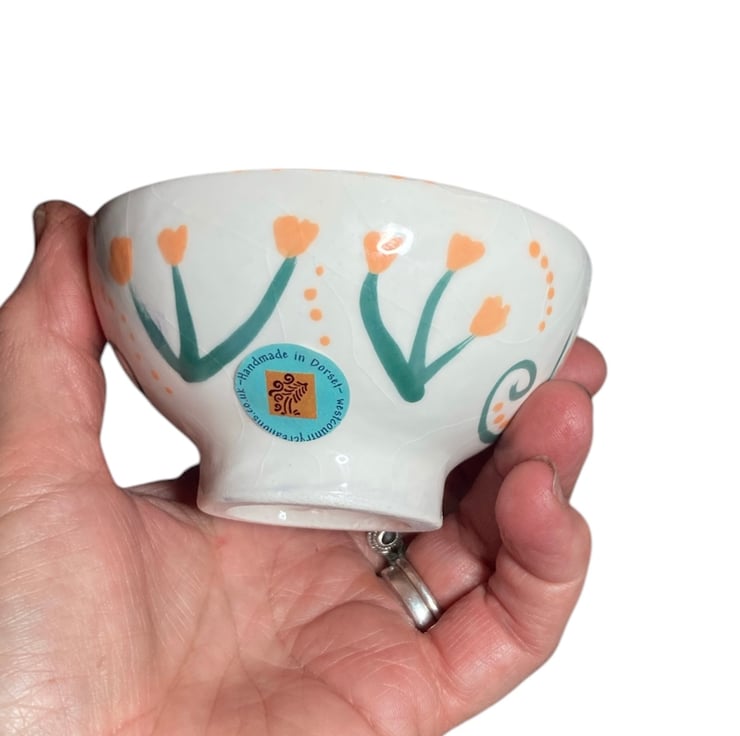 Hand built tiny earthenware bowl with unique hand painted floral pattern.