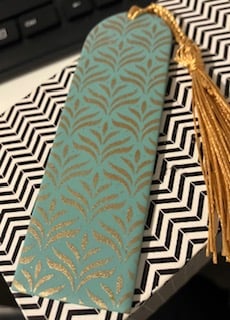 Handmade, light Turquoise, elegant print polymer clay bookmark, with a golden silky tassel.