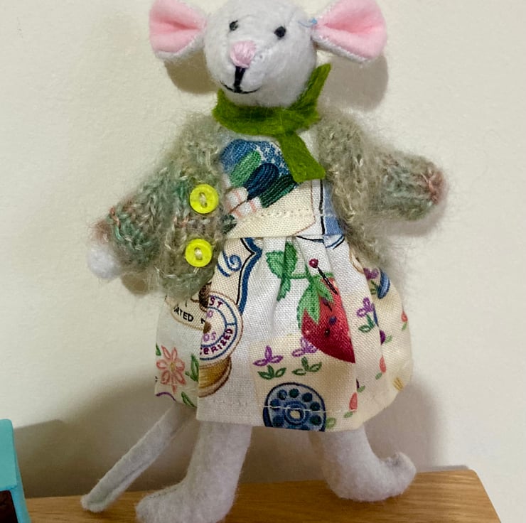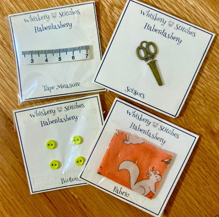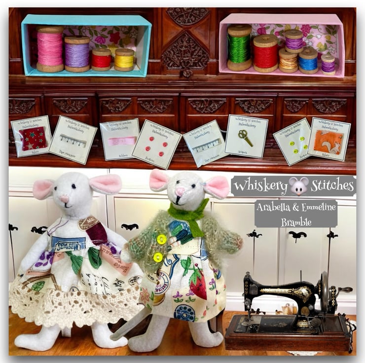 Arabella Bramble is one of the 4 sisters, who run the ‘Whiskery Stitches’ haberdashery in the Burrows in Mulberry Green. She is a pretty little mouse in an unusual vintage haberdashery print dress. She comes with 4 little haberdashery packets - tiny scissors, buttons, fabric and a tape measure and a tiny box of wooden cotton spools - the spools are all glued into the box and it makes a nice little shelf for a pretend haberdashery shop. Arabella is one of the Little Nippers - tiny mice who live in a maze of tunnels underneath the barn at Mulberry Farm. All of the Little Nippers are named after herbs and meadow flowers. The Little Nippers are 14cm tall. Clothes made especially to fit them are also available in my shop.