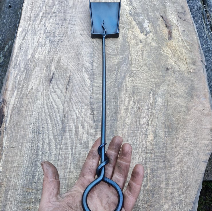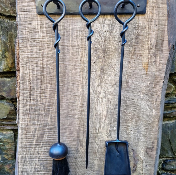 An elegantly hand forged wall mounted fire set comprising of a fire poker, brush, shovel and a wall mounted back plate of which the tools can hang slightly away from the wall. The design encoporates a wrap around 'Mouse Tail' design for a stylish look.