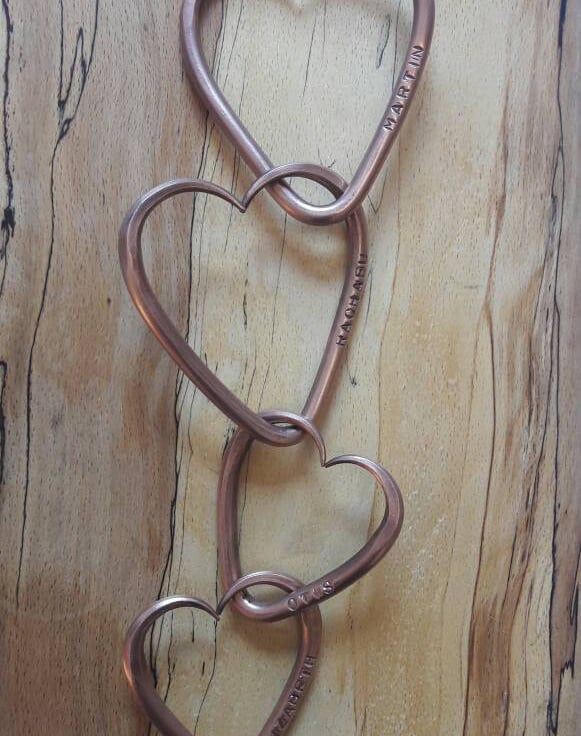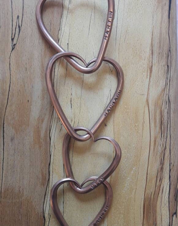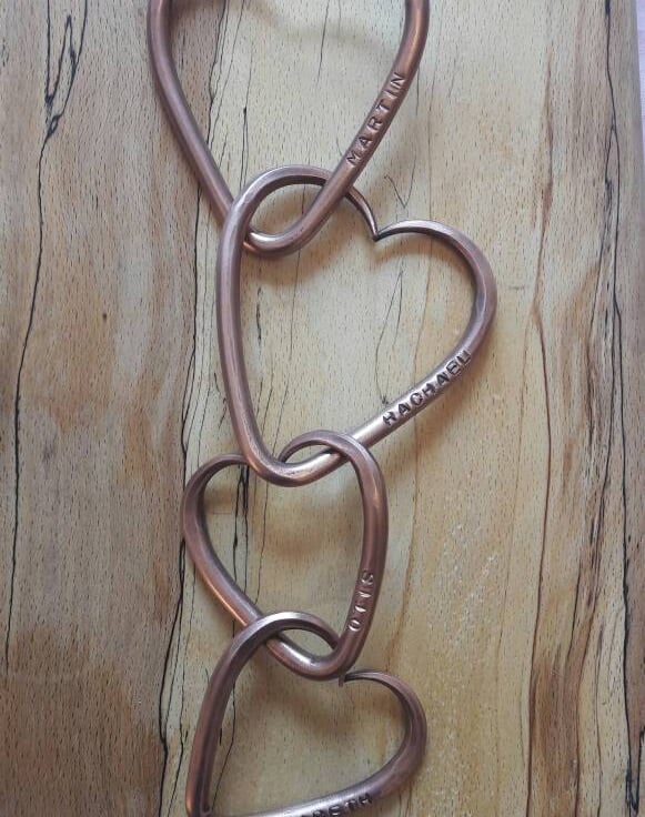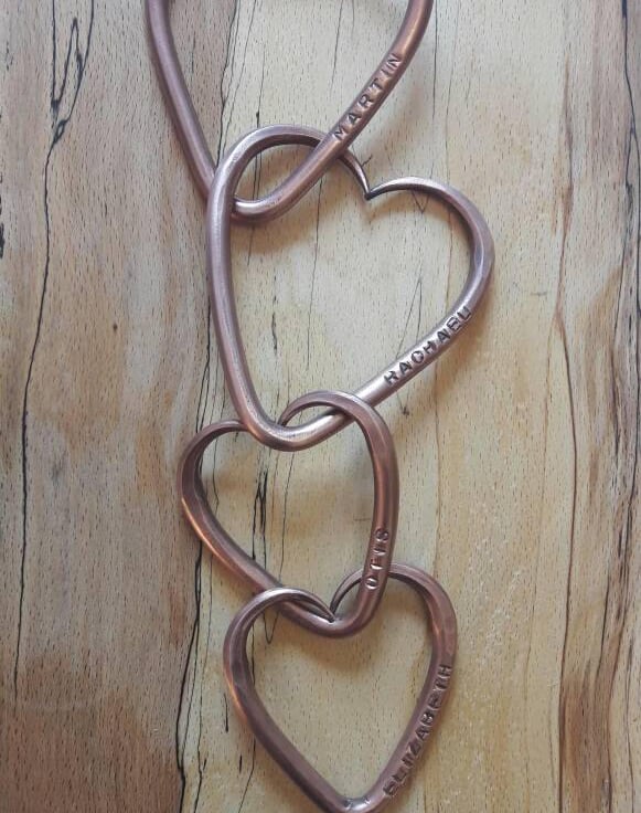 Each love heart is individually made and personalized with you and your partner's name, before being joined together permanently. I then forge two slightly smaller hearts to represent your children before joining them all together to symbolize love, strength and family bonds.