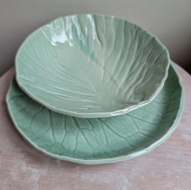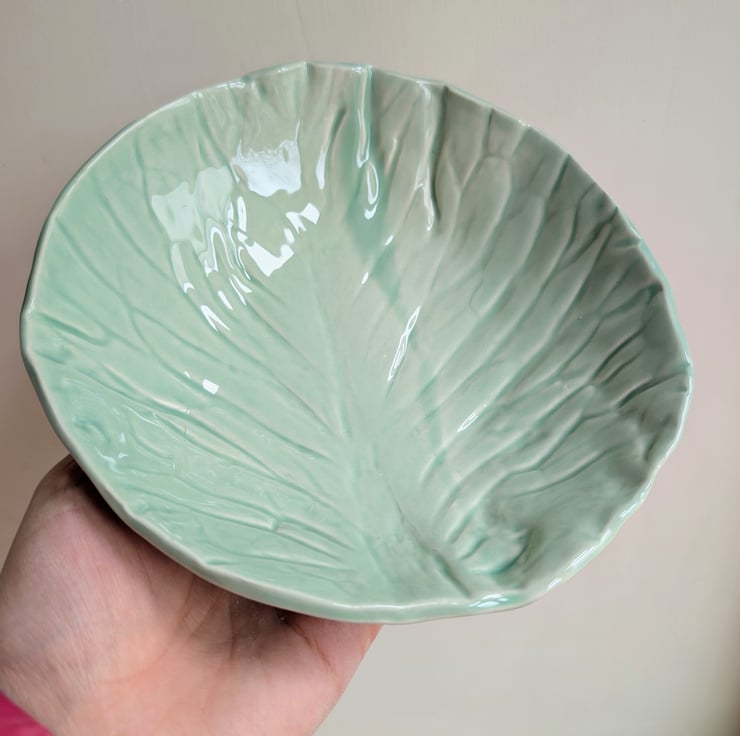 Hand thrown from a slab of clay with a large cabbage leaf imprint. Once it has taken its shape over a former the foot ring was added and finished on my potters wheel. After bisque firing and glazing in lead free food safe glaze. The final firing then took place .