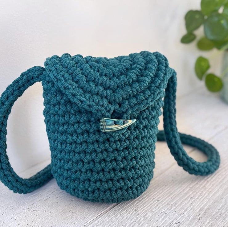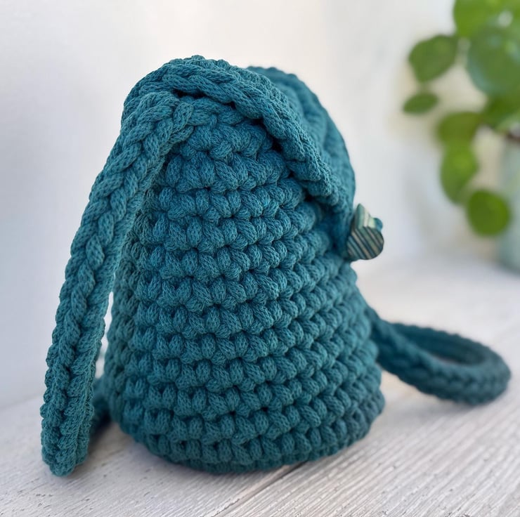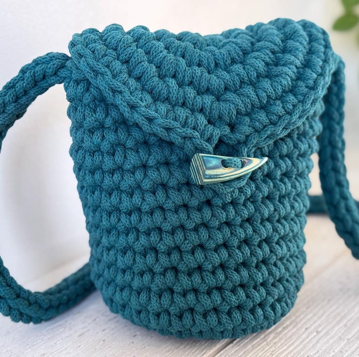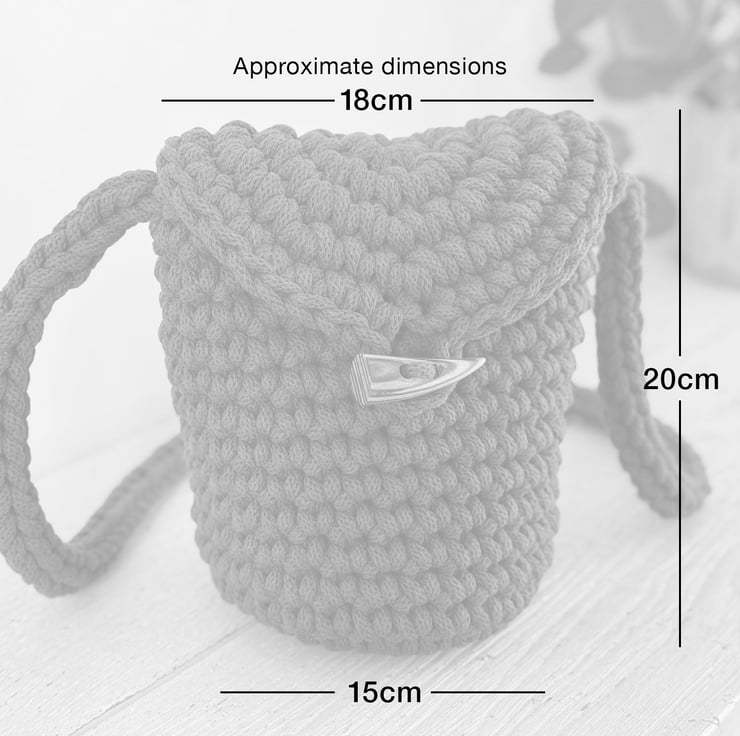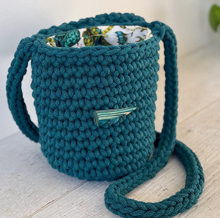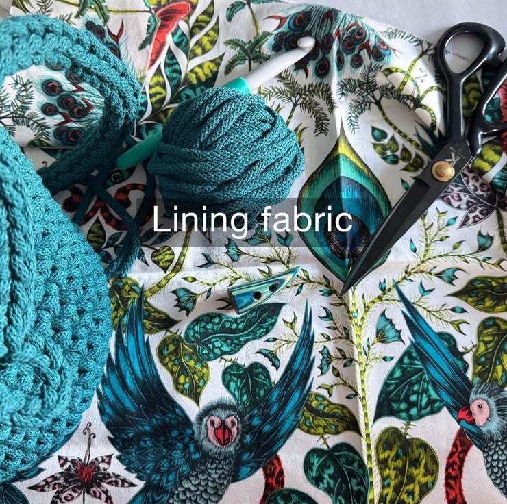 This is a handmade bag crocheted from recycled cotton cord and lined with Emma Shippley fabric shown in detail in images above. It has an internal patch pocket and fastens with a wooden toggle.