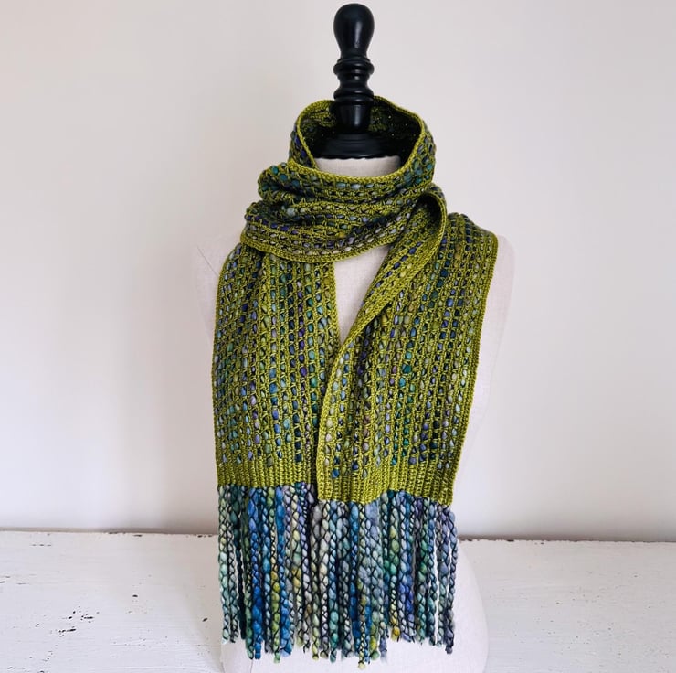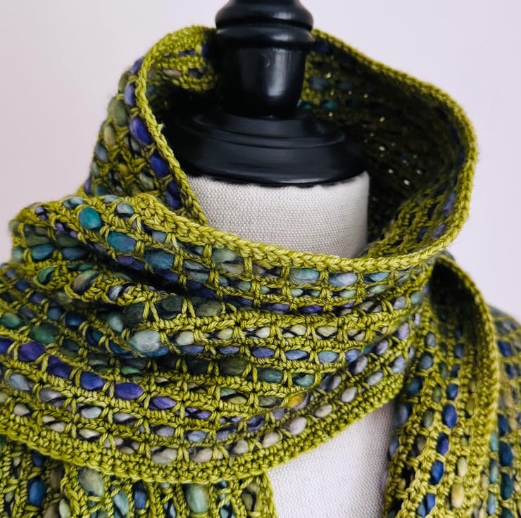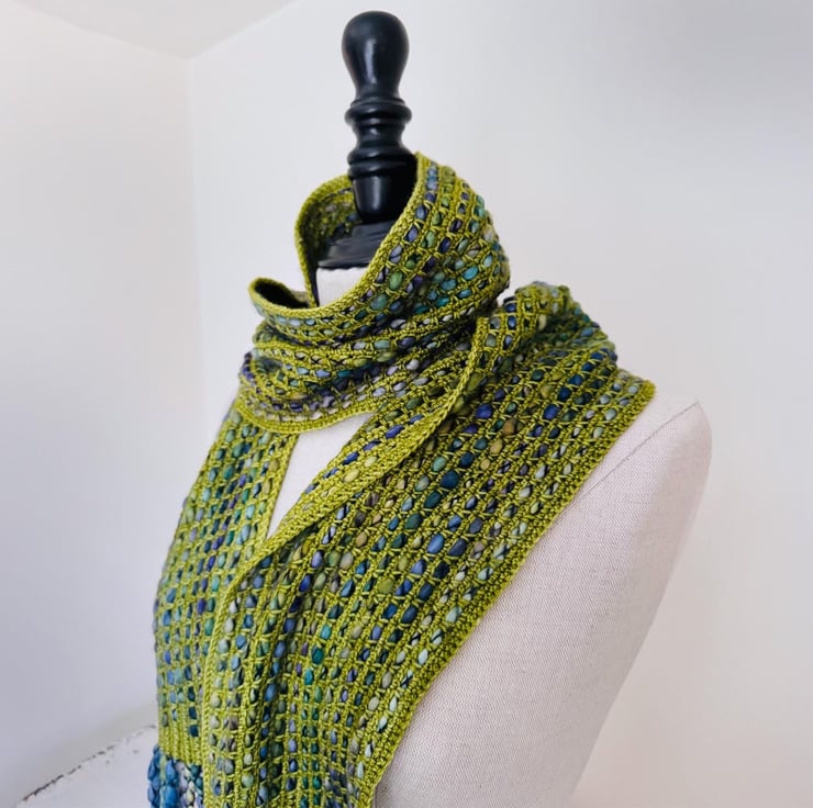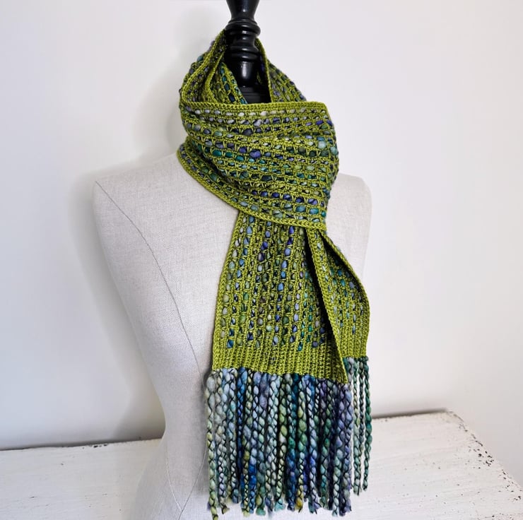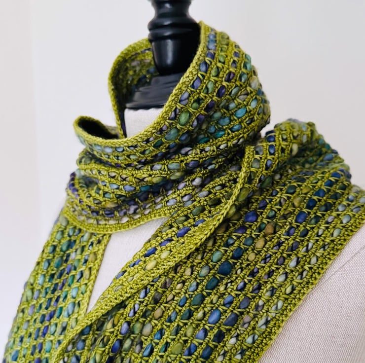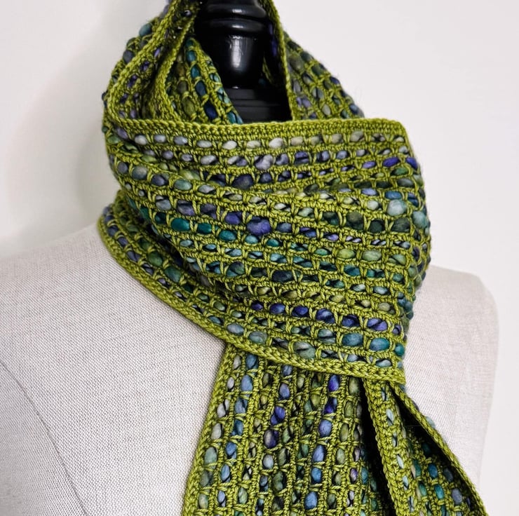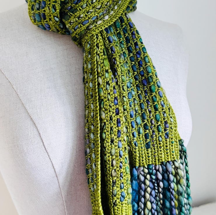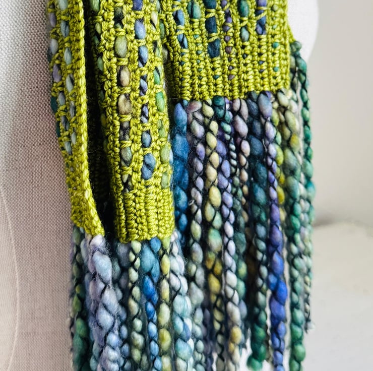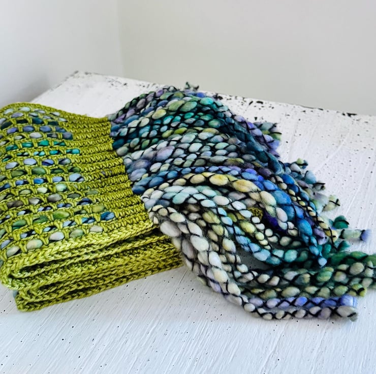 I ve used a bulky, thick, and thin single-ply yarn with a gorgeous variegated grean and blue colour palette. The yarn is encased in a black binder thread, which enhances the texture.