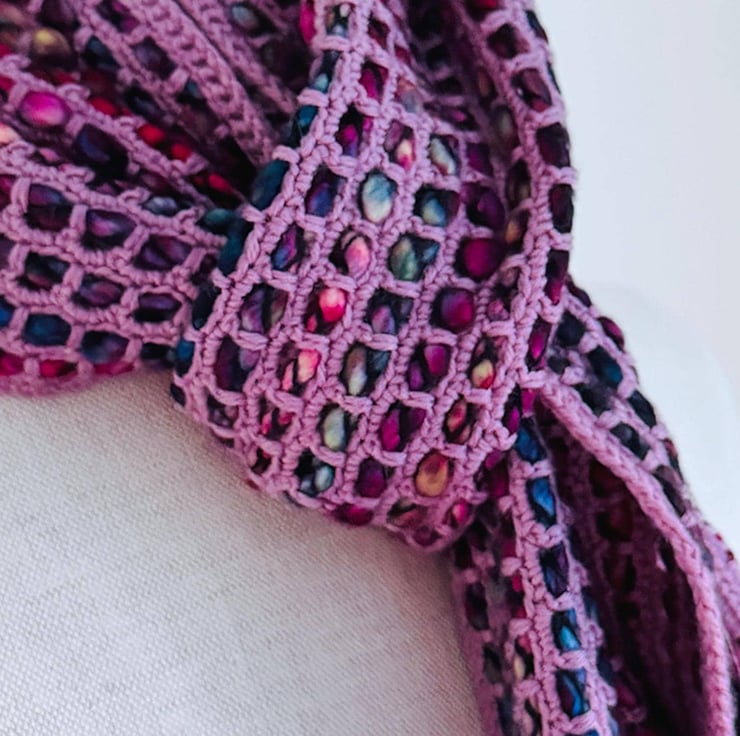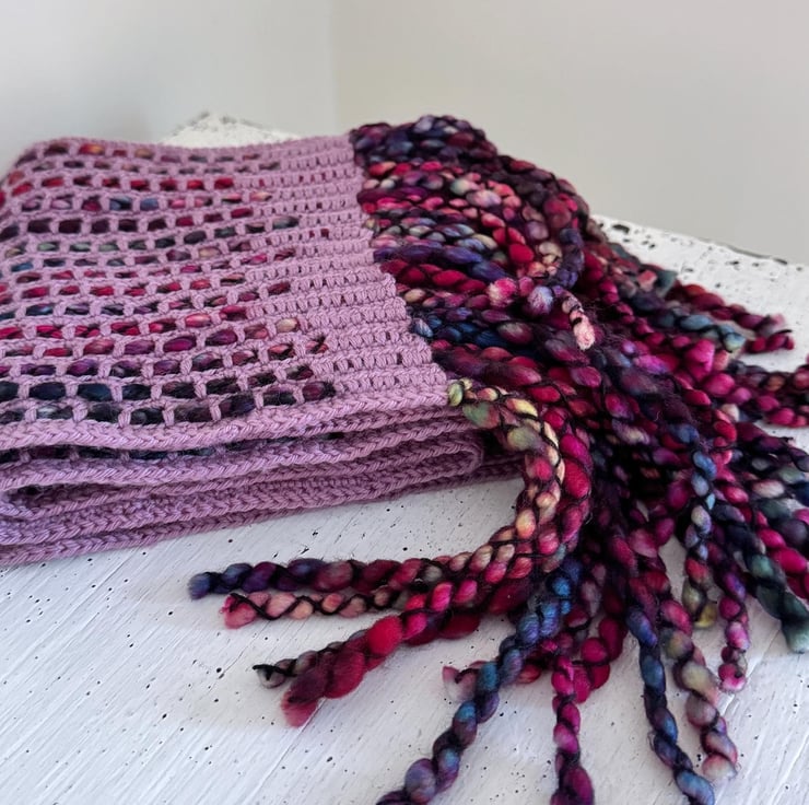 I ve used a bulky, thick, and thin single-ply yarn with a gorgeous variegated red, blue and purple colour palette. The yarn is encased in a black binder thread, which enhances the texture.