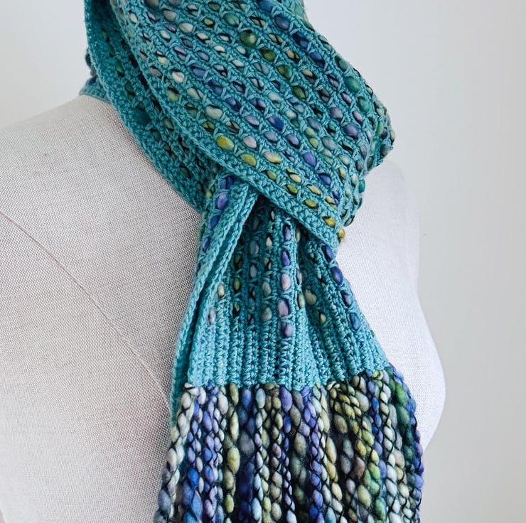 I ve used a bulky, thick, and thin single-ply yarn with a gorgeous variegated green and blue colour palette. The yarn is encased in a black binder thread, which enhances the texture.