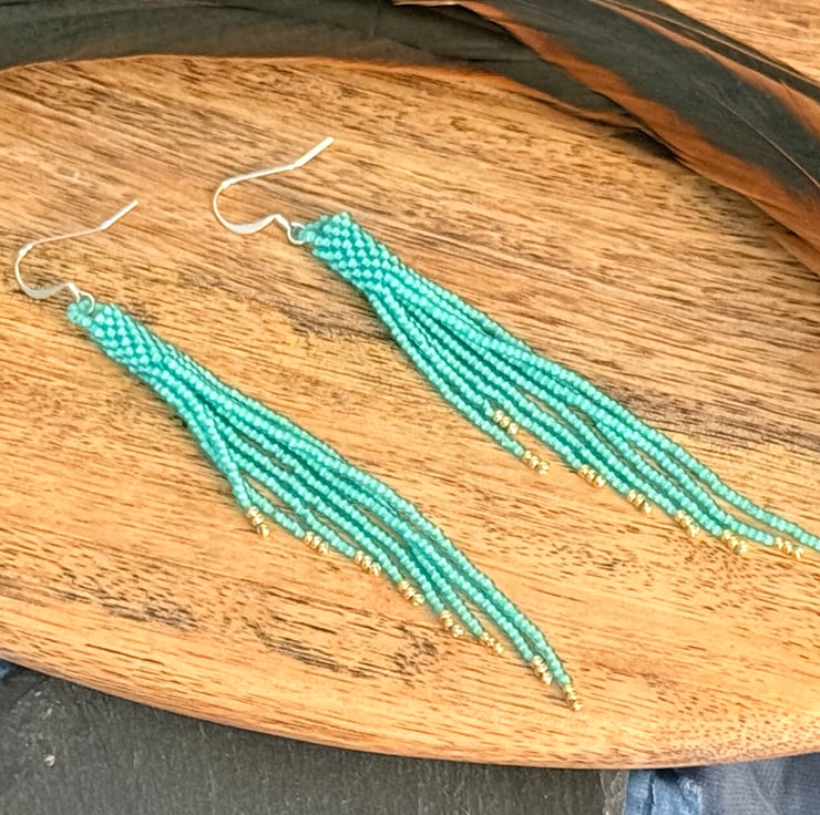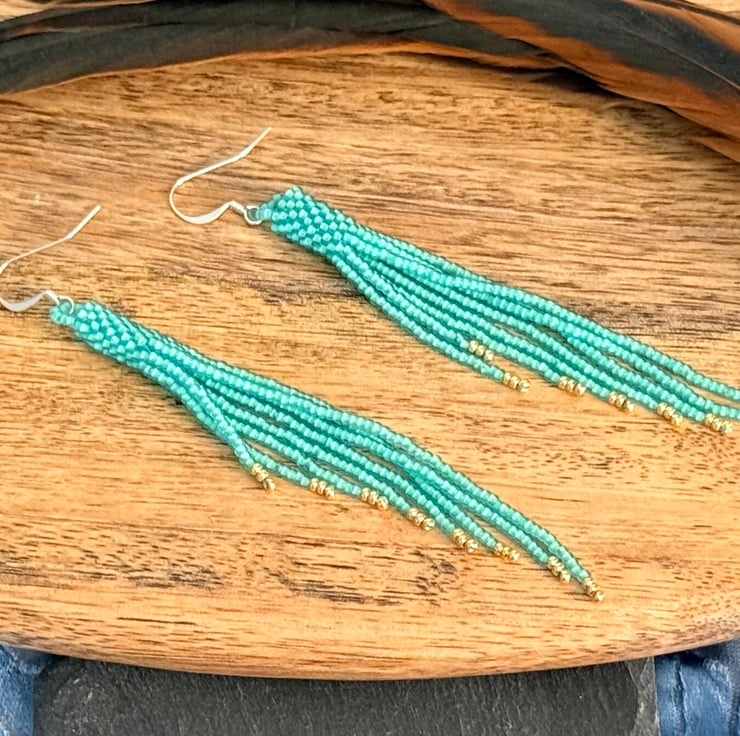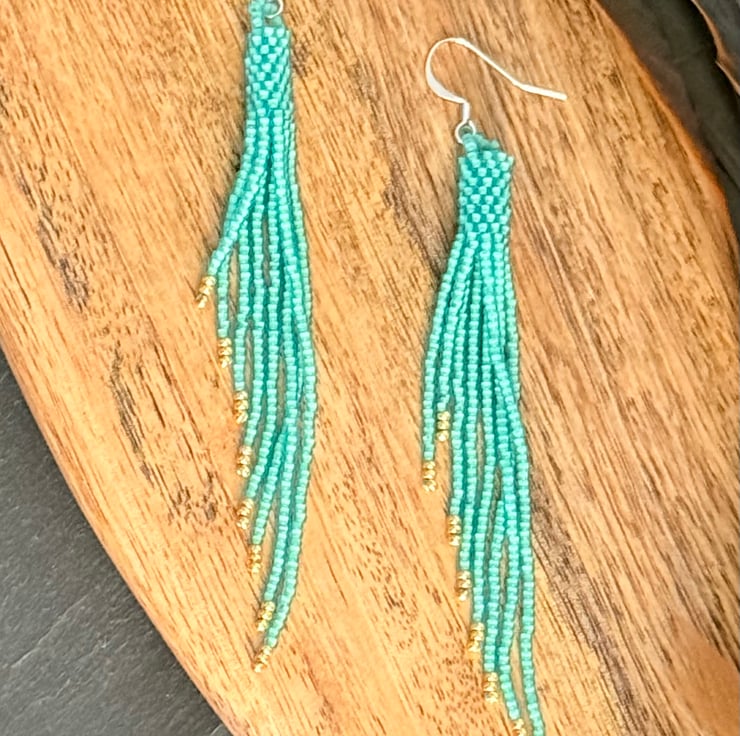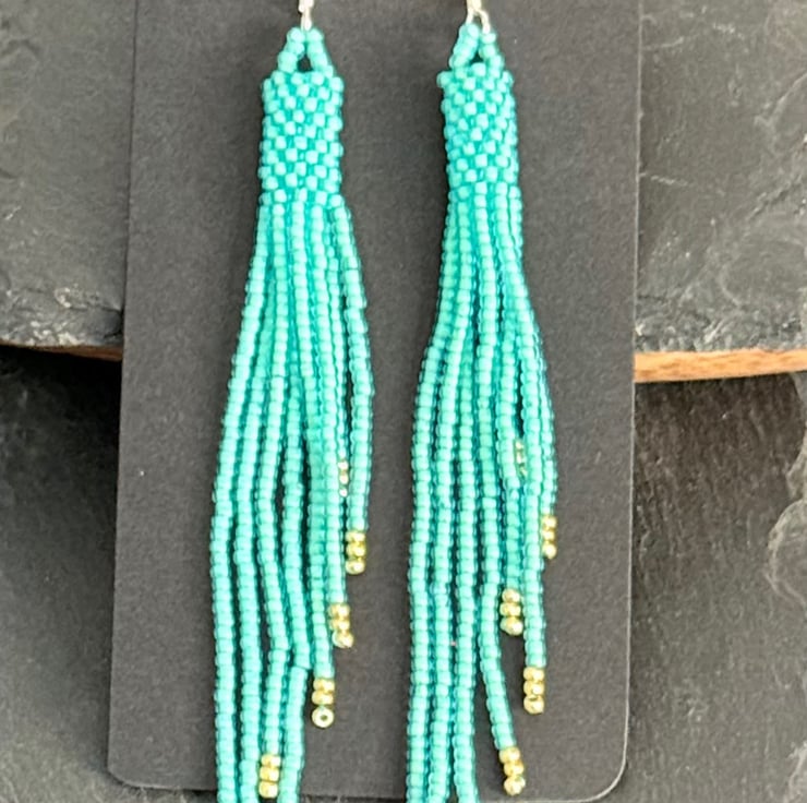 The small Miyuki seed beads have been handwoven in a tube shape and there is an ascending beaded fringe in the same green colour below. The end of each beaded strand is finished in gold beads.