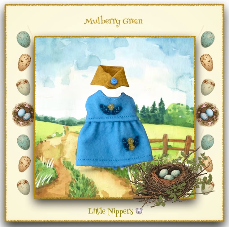 A sweet little turquoise felt pinafore dress, embroidered with flowers and matching cowl, made specially to fit the Little Nippers. The pinafore fastens at the back with a little popper.