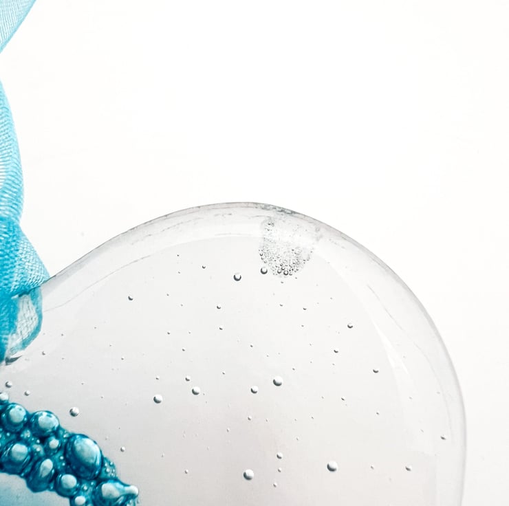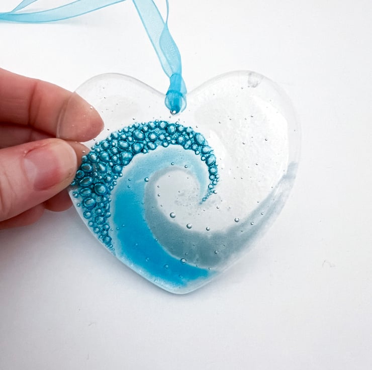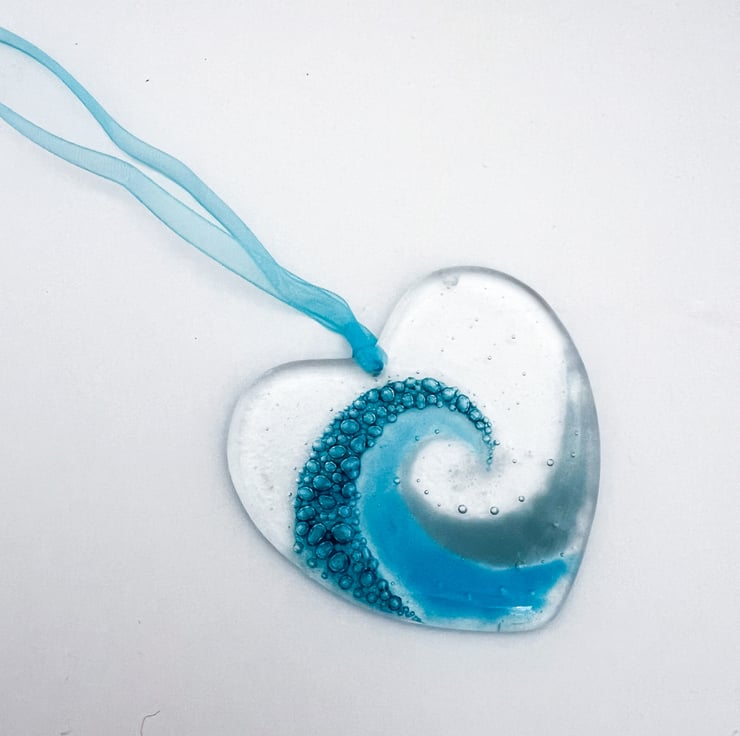 I hand cut art glass into 2 heart shapes and use specialist paints and powdered glass to create my wave design. I then fuse it overnight slowly in my kiln. In the heat of the kiln, the specialist paint changes into hundreds of tiny turquoise bubbles.