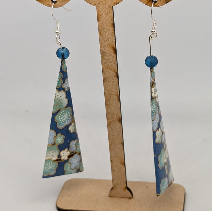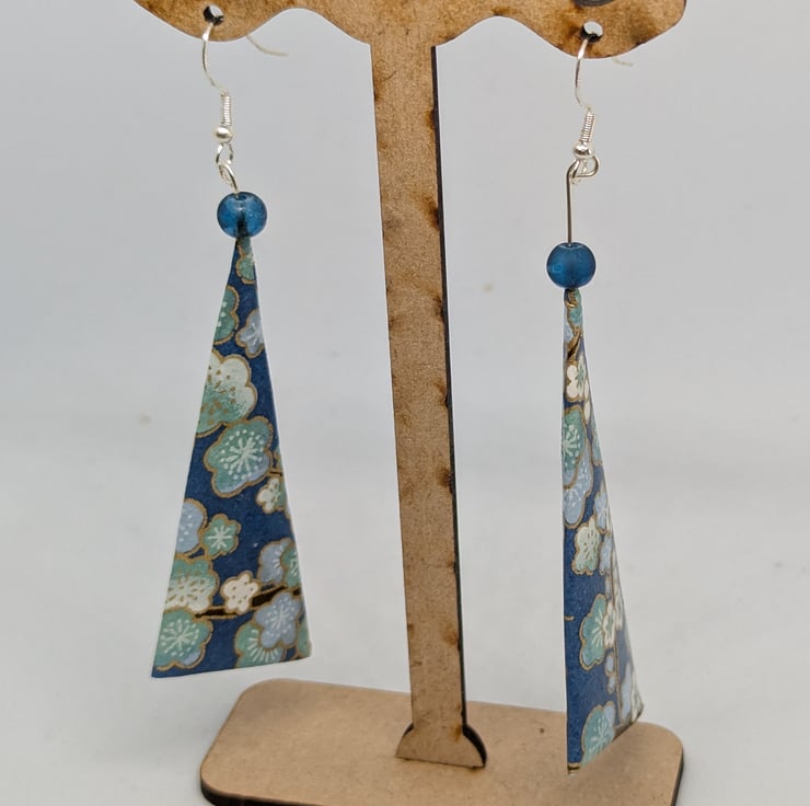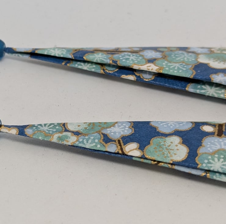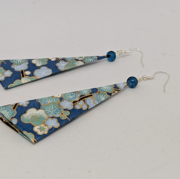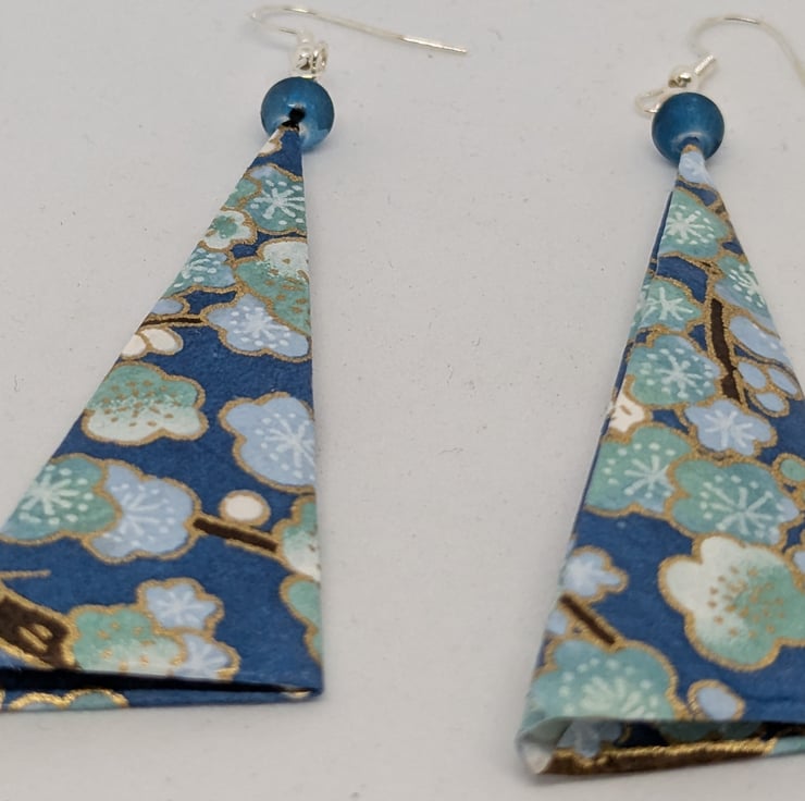 These unique earrings have been created with traditional Japanese washi paper with an elegant pattern of plum tree flowers in white and blue, on a turquoise background. The paper has been folded using origami techniques into a long triangle shape. The earrings are enhanced with small blue beads, and are 6cm in length, with sterling silver ear hooks. Hand crafted and designed in Glasgow, Scotland, these earrings would be a great addition to any collection. A perfect and unique choice for a first wedding anniversary gift!