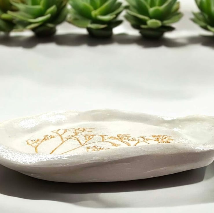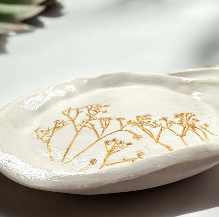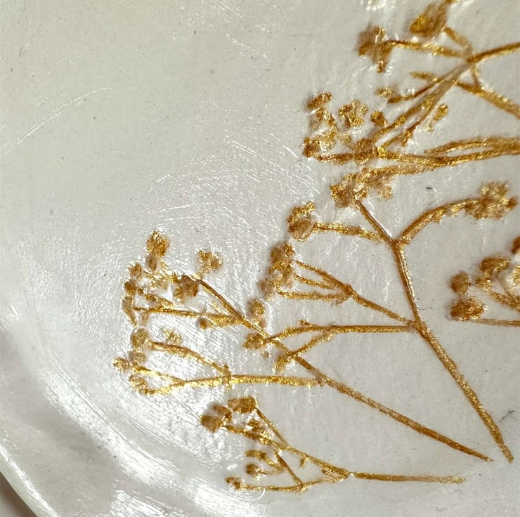Having recently created some beautiful wreaths using a mixture of fresh and dried flowers wanted to explore flowers in clay. This dish was embossed and then handpainted with gold and I'm super pleased with the result!