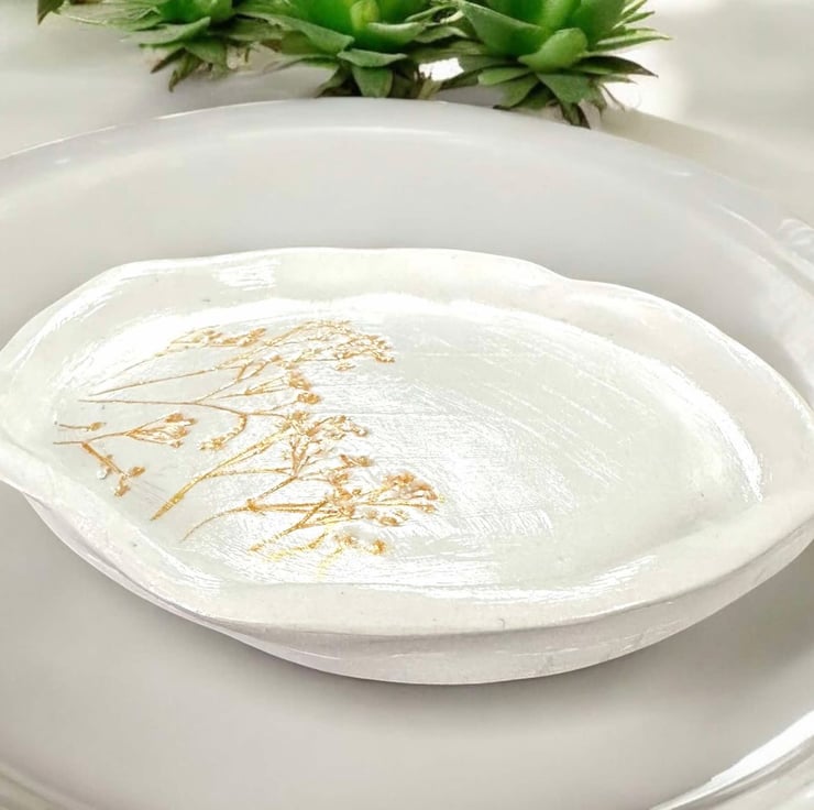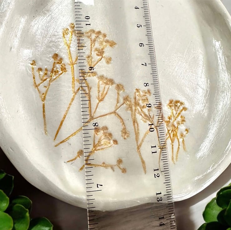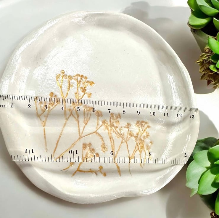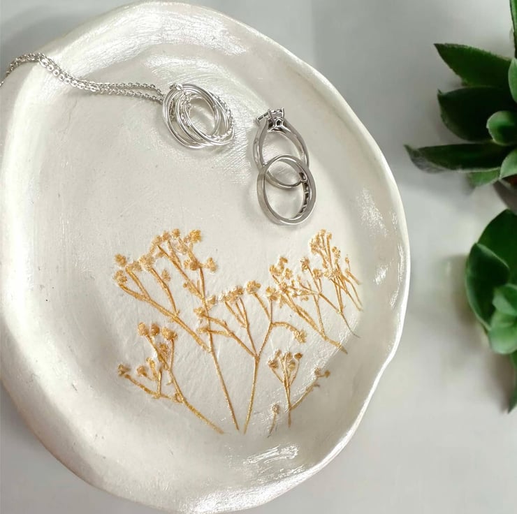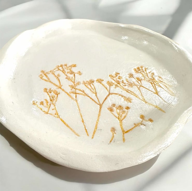 The dish takes 7 days to create as each process needs to be dry. It has been handmade using DAS clay prior to being embossed with pressed Gypsophilia and handpainted with metallic gold paint and a protective varnish.