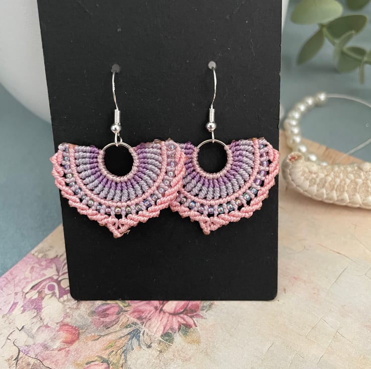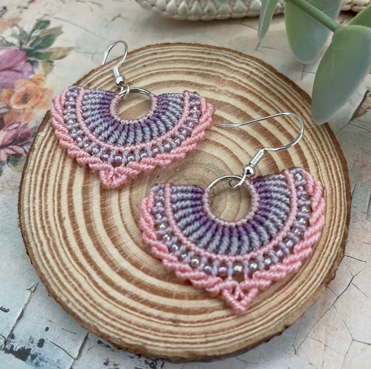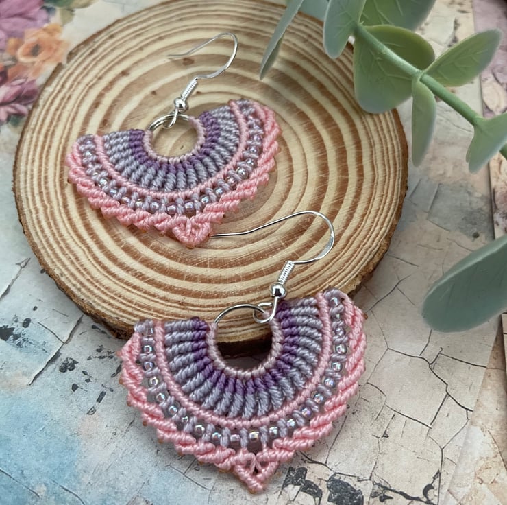 Designed and created by me in my Kent studio in pretty colours of green , blue and yellow interwoven with tiny glass seed beads and using unbreakable c-lon macrame thread which makes them very light weight but makes a big statement .