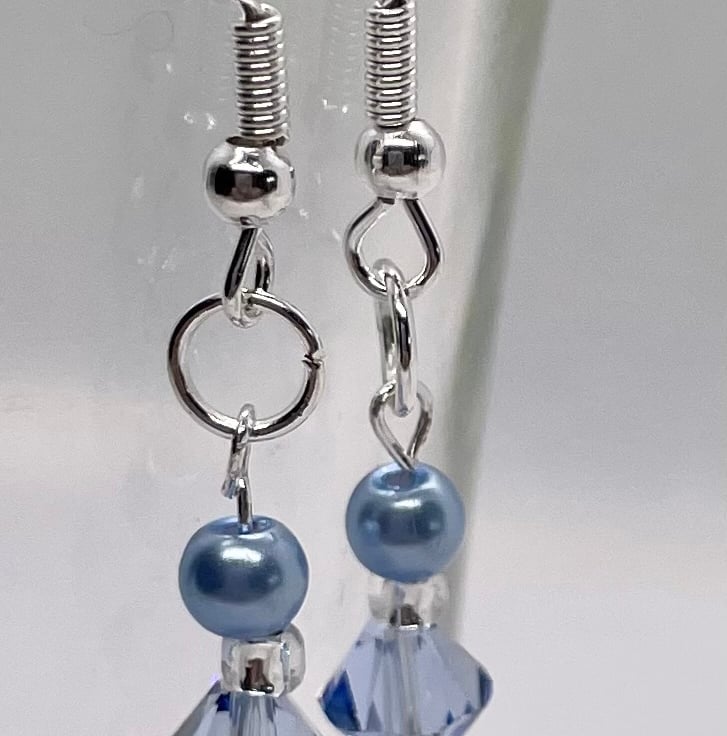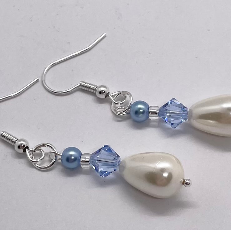 Lovely blue shell pearl teardrop, Swarovski crystal bicones and glass pearl earrings. Silver plated earring hooks and components.