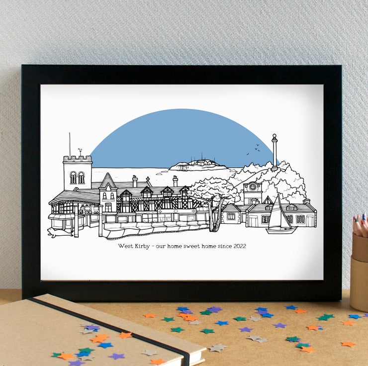 A pretty print of my skyline illustration of the most famous landmarks in Wirral's West Kirby.