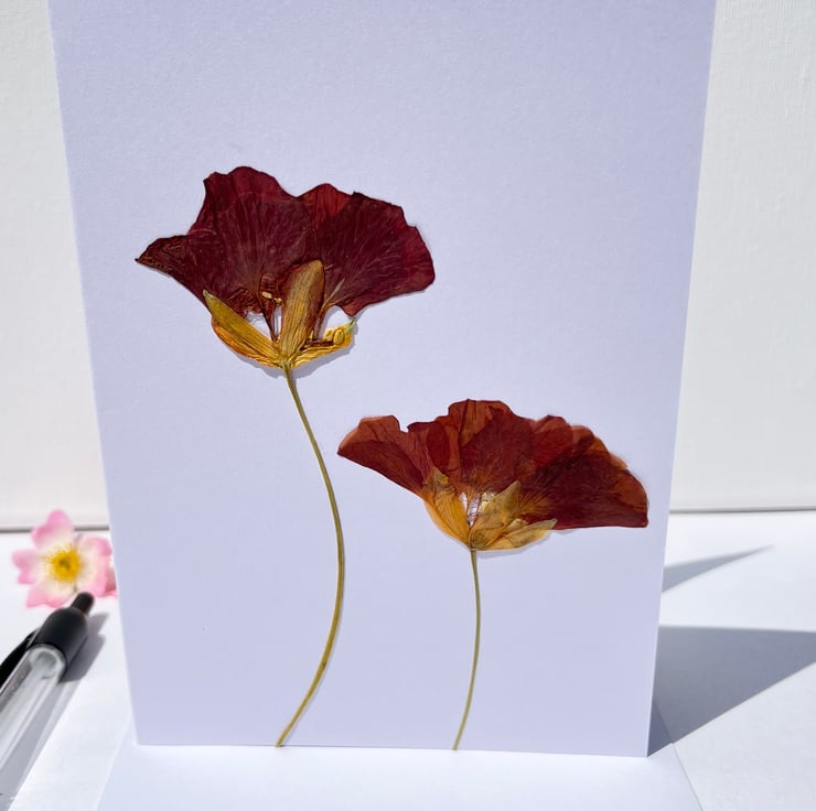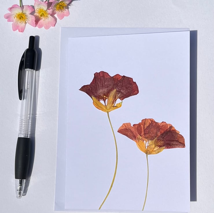 This lovingly handmade real pressed flower greeting card is made using nasturtiums grown from seed in our garden.