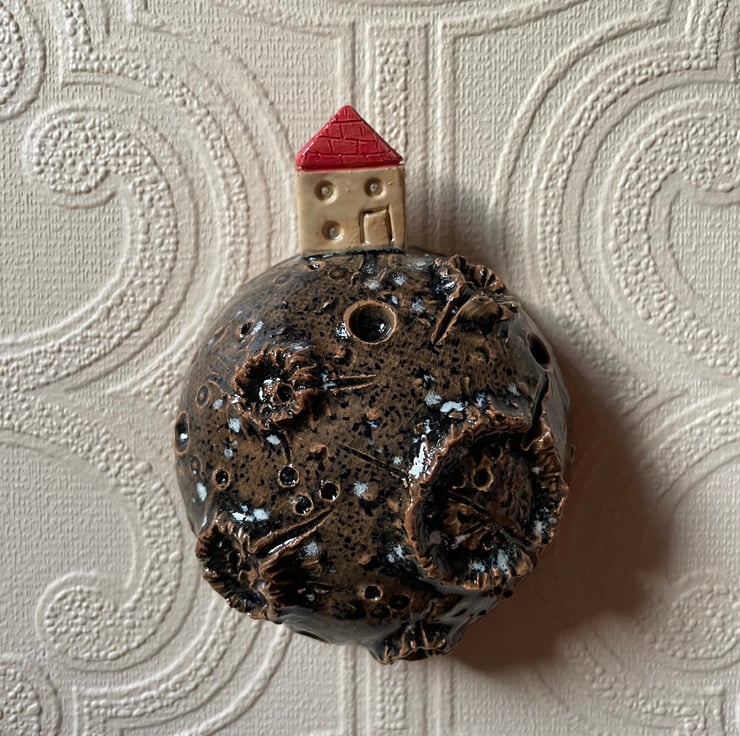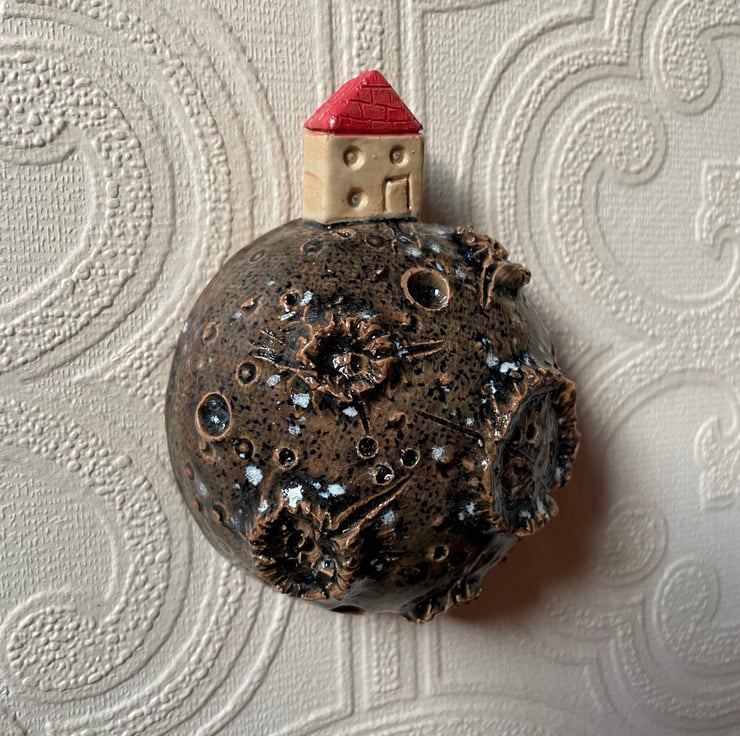 This ceramic hand sculpted moon with little ceramic house on top is a beautiful one of a kind piece of art that will look great on your wall as part of a gallery wall or on its own! Kids will also love it & encourage their imagination if they love anything interesting, fun or planet related.