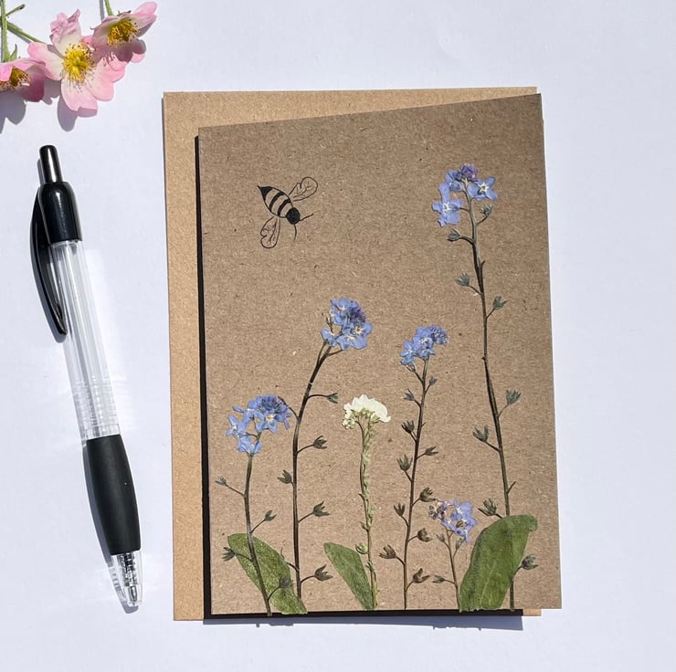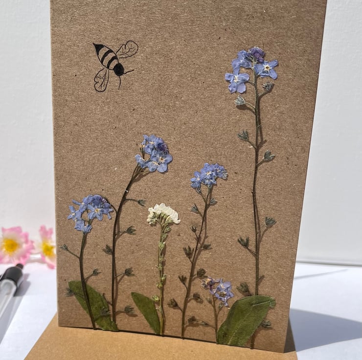 This lovingly handmade real pressed flower greeting card is made using forget-me-nots grown in our garden and a hand drawn bee.