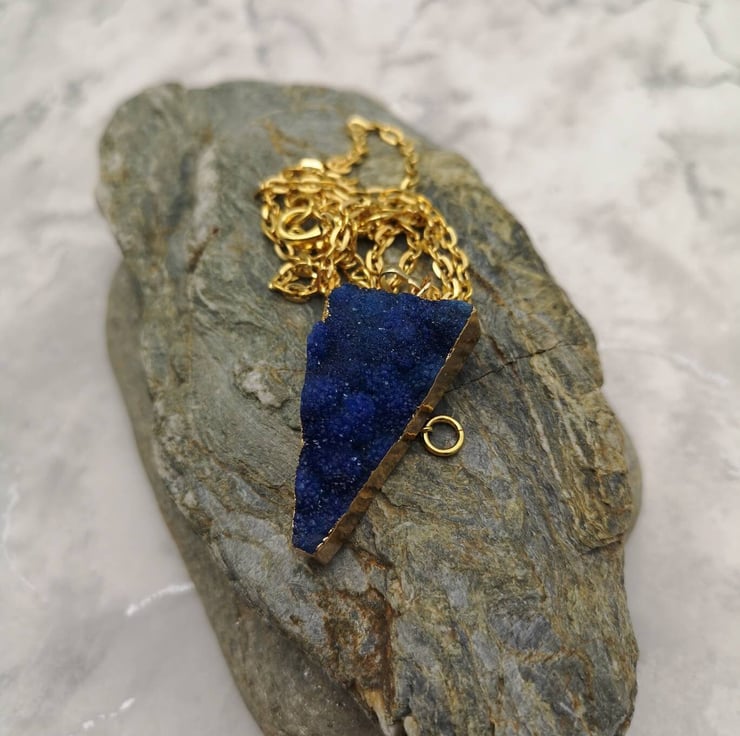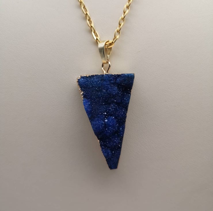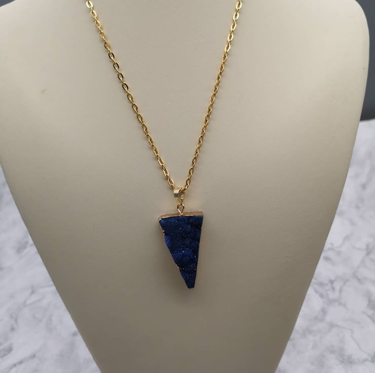 This gorgeous pendant is a blue druzy quartz gemstone pendant. It is approx 22 mm x 37 mm in size and hangs on a 16 inch, gold plated cable chain.