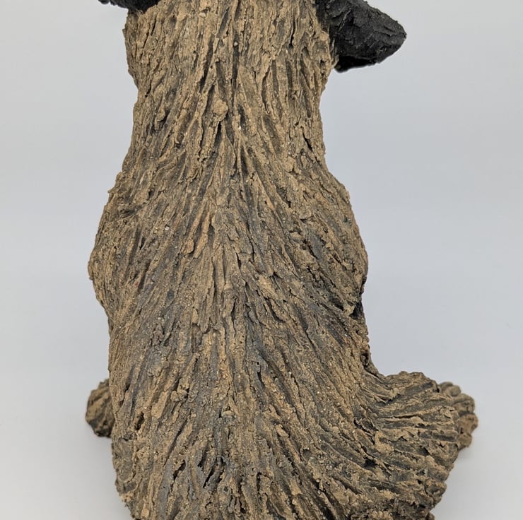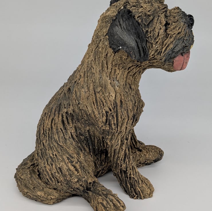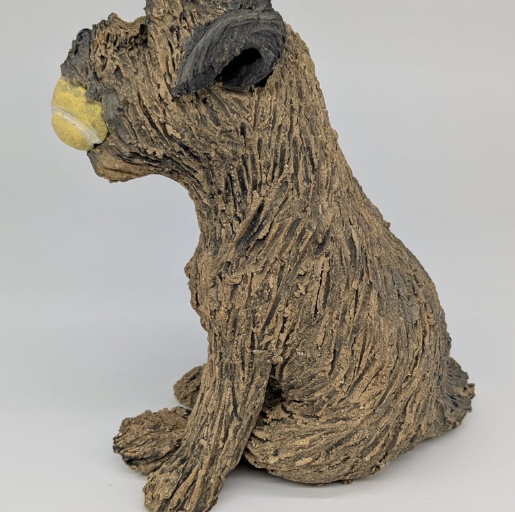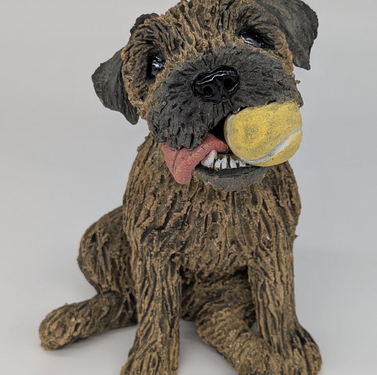 Border Terrier and Ball hand sculpted in stoneware clay with makers mark and date on the base.