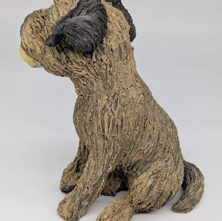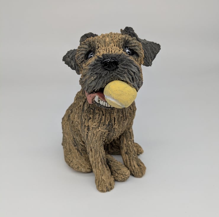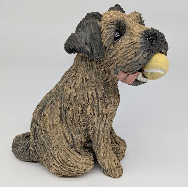 Border Terrier and Ball hand sculpted in stoneware clay with makers mark and date on the base.