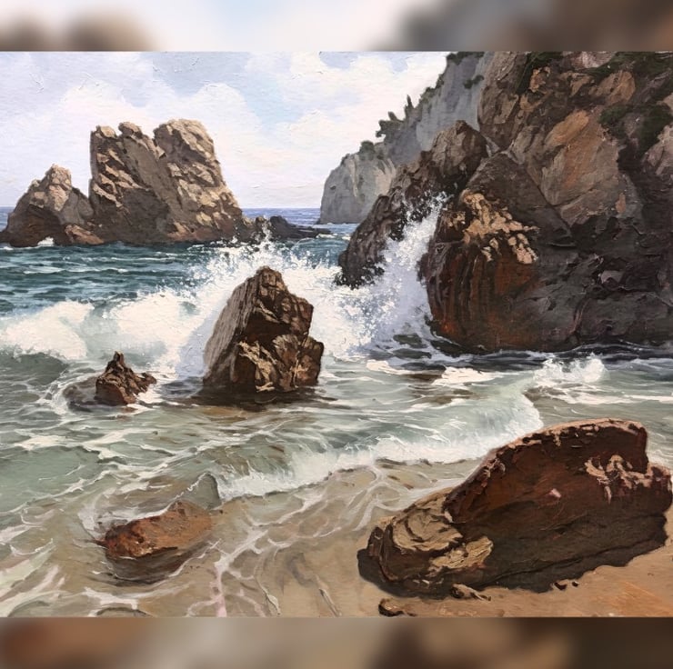 This artwork is a tribute to nature’s power, capturing the timeless dance between land and sea. Whether you're drawn to the energy of the crashing waves or the tranquil clarity of the shallows, this painting will transport you to a breathtaking coastal escape.