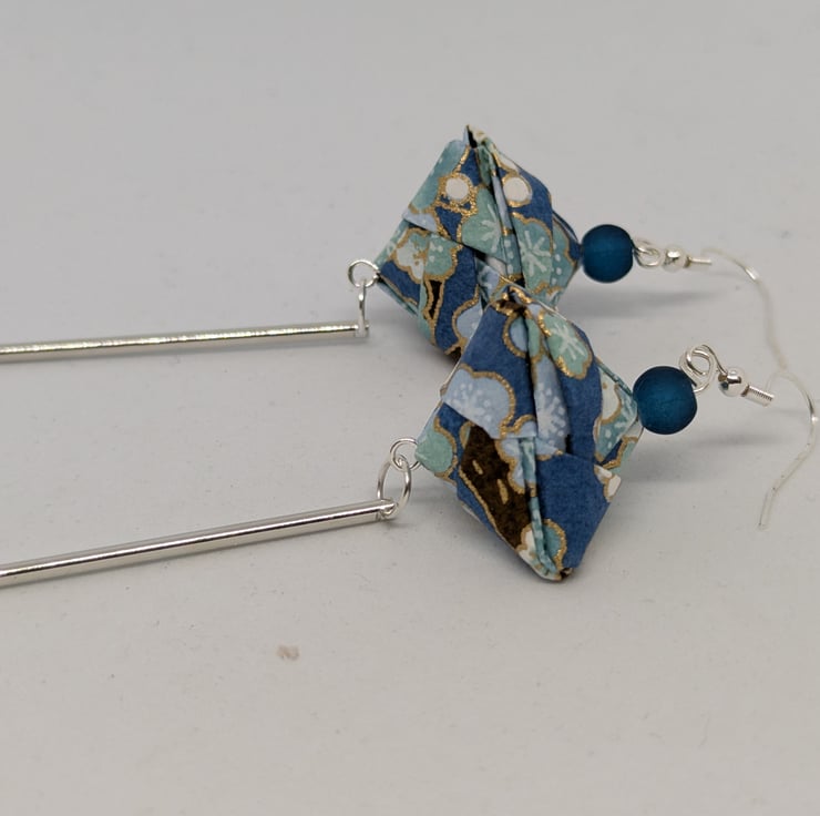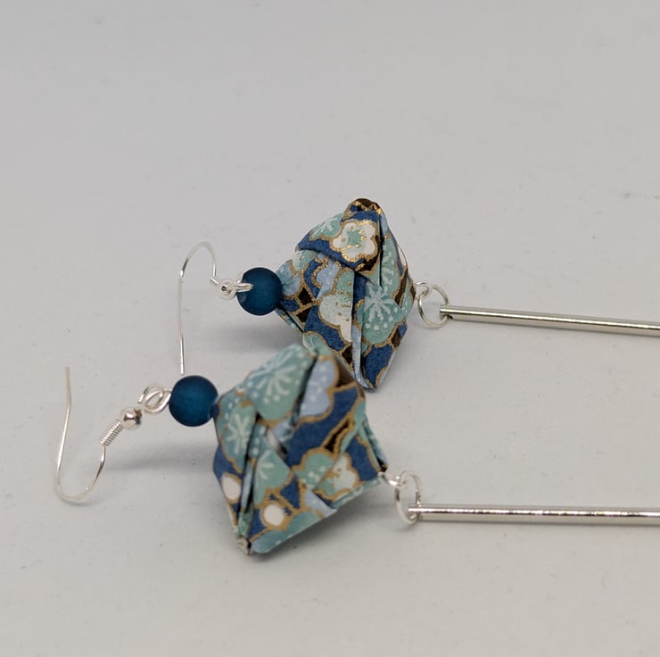 These unique earrings have been created with traditional Japanese washi paper with an elegant pattern of plum tree flowers in white and blue, on a turquoise background. The paper has been folded using origami techniques and a long silver-coloured dangle has been added to create earrings which are 7cm in length, with sterling silver ear hooks. Hand crafted and designed in Glasgow, Scotland, these earrings would be a great addition to any collection. A perfect and unique choice for a first wedding anniversary gift!