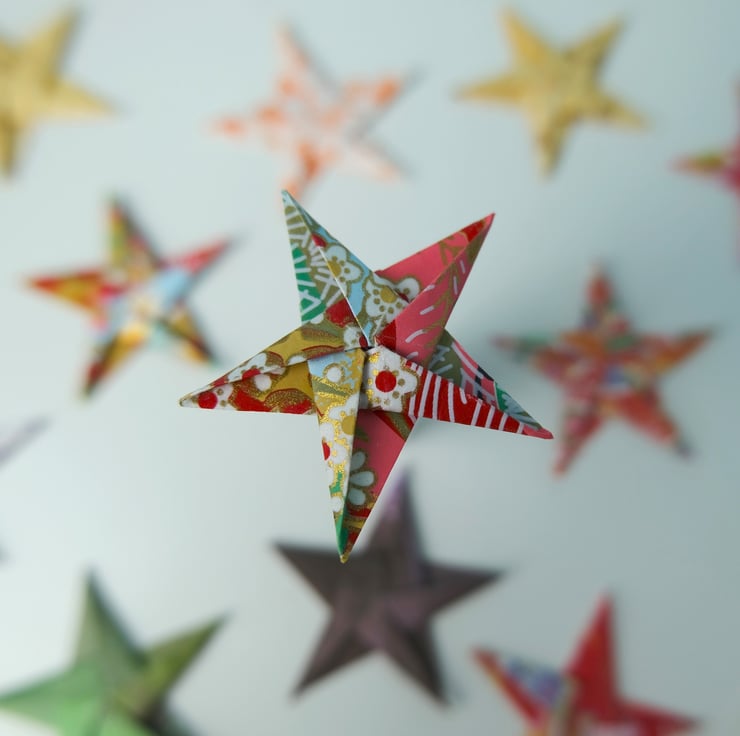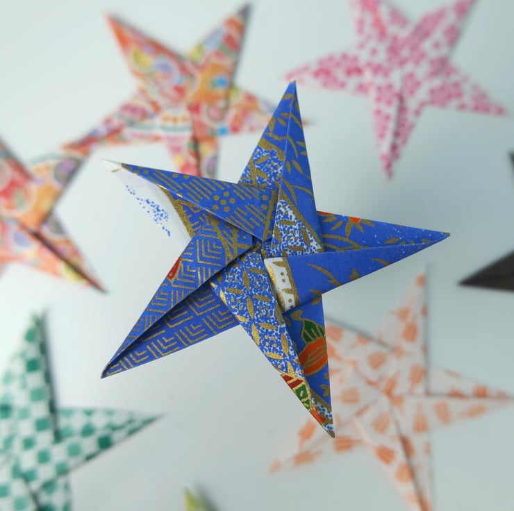 Colourful five pointed stars in assorted patterns and colours, made with very good quality washi paper, each star has been hand folded and finished with a small magnet on the back.