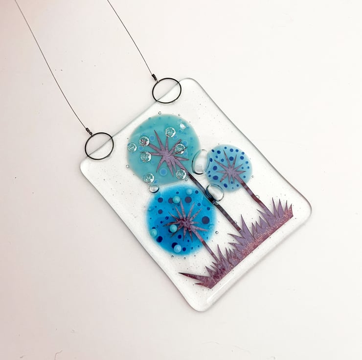 Fused glass square allium suncatcher. I've used tones of blue in my fused glass suncatcher inspired by the alliums that grow in my garden. This looks lovely hanging in a window. Each hanging is completely unique and would make a lovely gift to give a bit of colour and cheer to a friend or loved one.