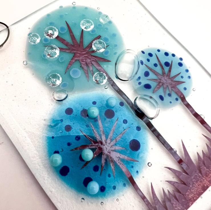 To make it, I started by cutting 2 rectangles of transparent art glass. I then hand cut allium stalk shapes from copper foil with a scalpel. I then stencilled powdered glass to make the flower heads and added the copper, capping it all with the second piece of glass. It then all goes into my glass kiln and is slowly fused overnight. Once completely cooled, I then added enamel paints and coloured and dichroic dots which I have made previously to give some added interest to the design. A second firing is done overnight the next day to tack fuse the dots onto the design, so that they stand proud of the glass, giving it a 3D effect