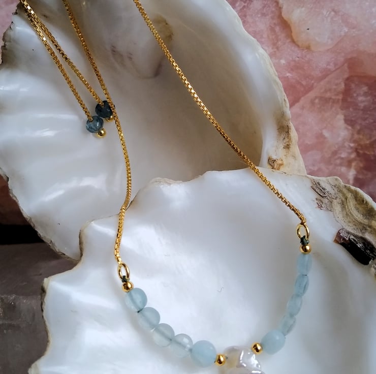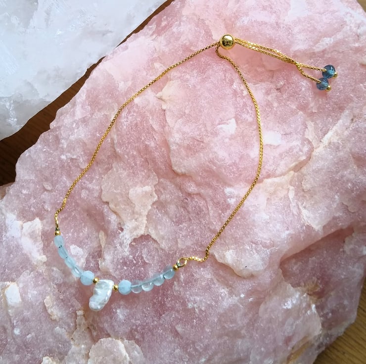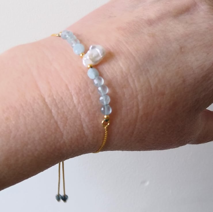 Considered a stone of serenity, this cool, calming aquamarine is combined with a featured white natural freshwater keshi pearl, for even more softening elegance. This timeless bracelet of gold plated 925 sterling silver box chain has a fully adjustable slider clasp so the wearer can find their own perfect fit. Each beautifully faceted 4mm Aquamarine is coin shaped giving a comfortable flat surface to each gemstone.