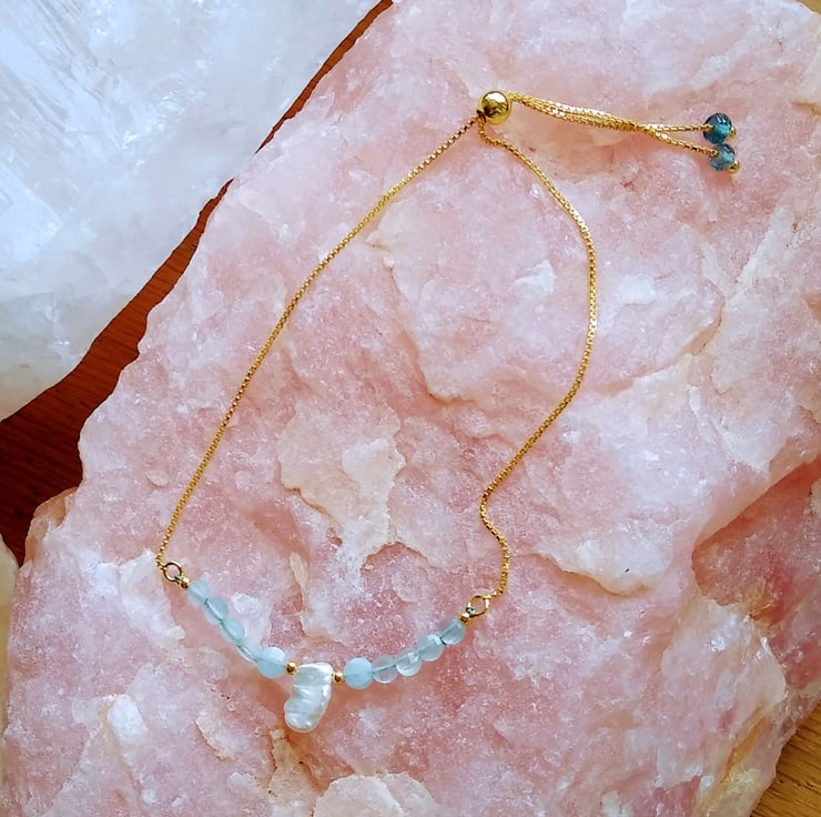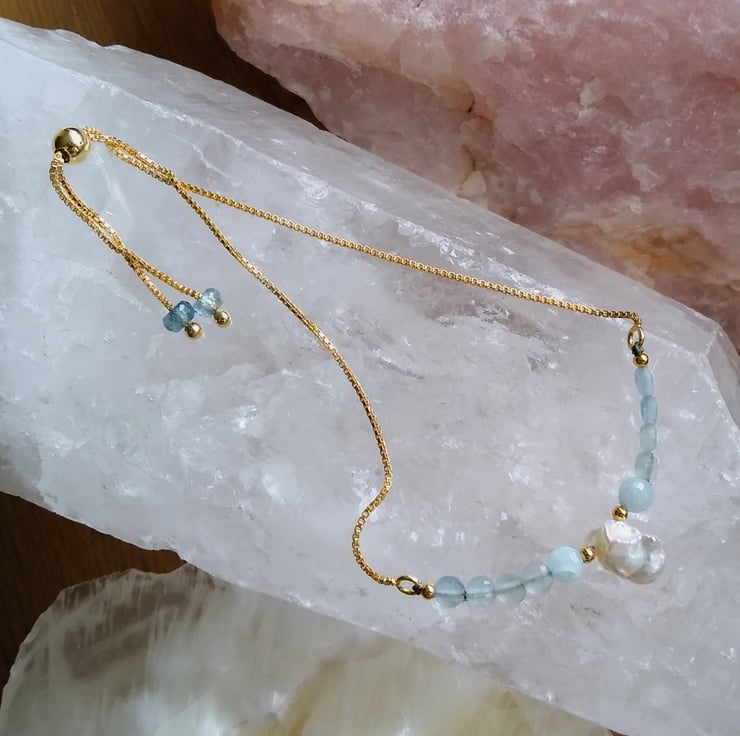 Natural Aquamarine & Freshwater Keshi Pearl Gold Sterling Silver Slider Bracelet