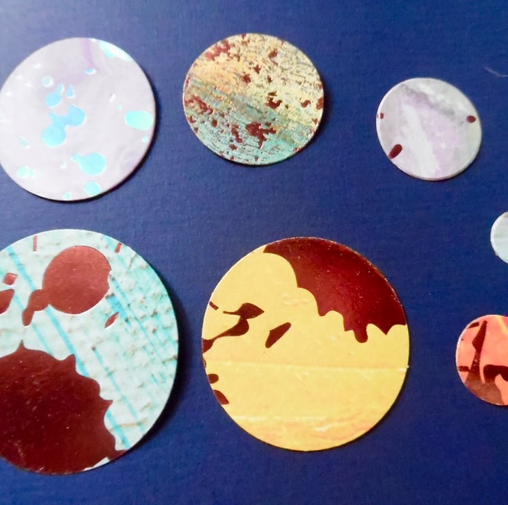They are cut from a good quality 150 gsm paper in random planetary colours with a random foil pattern .