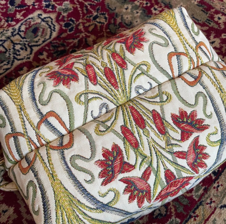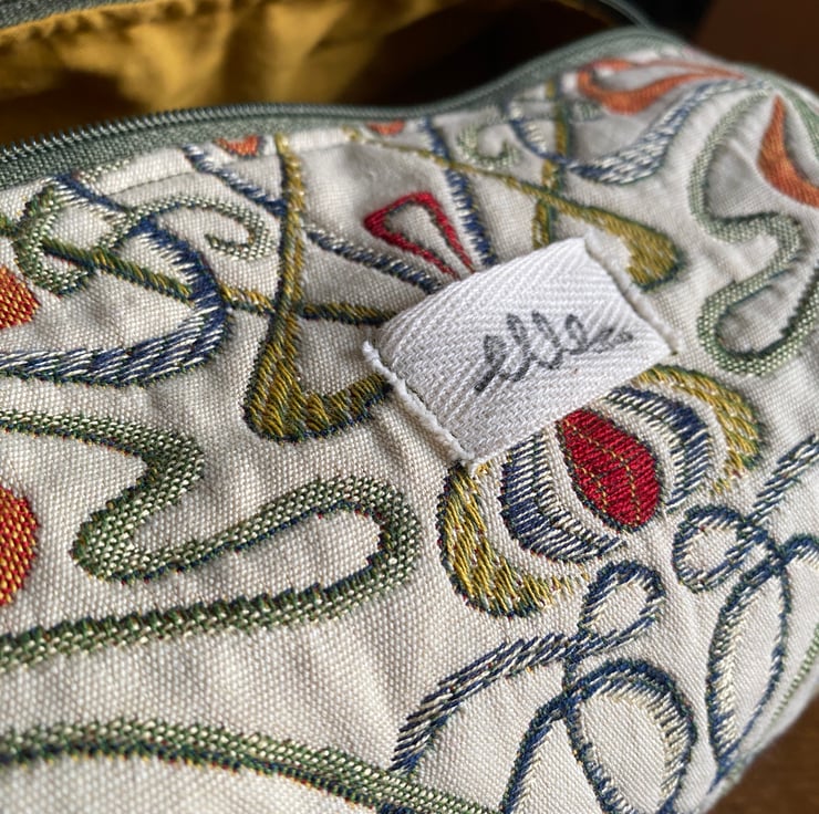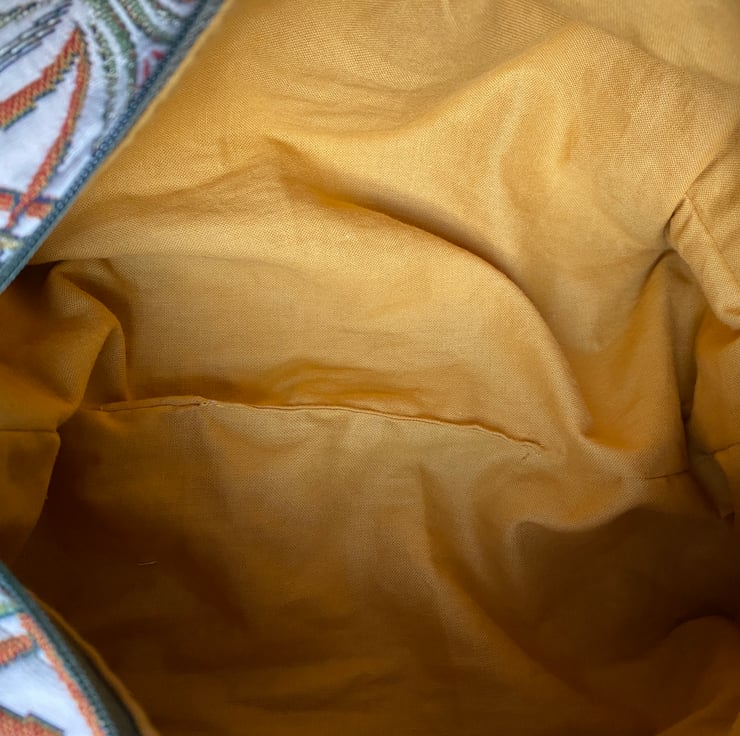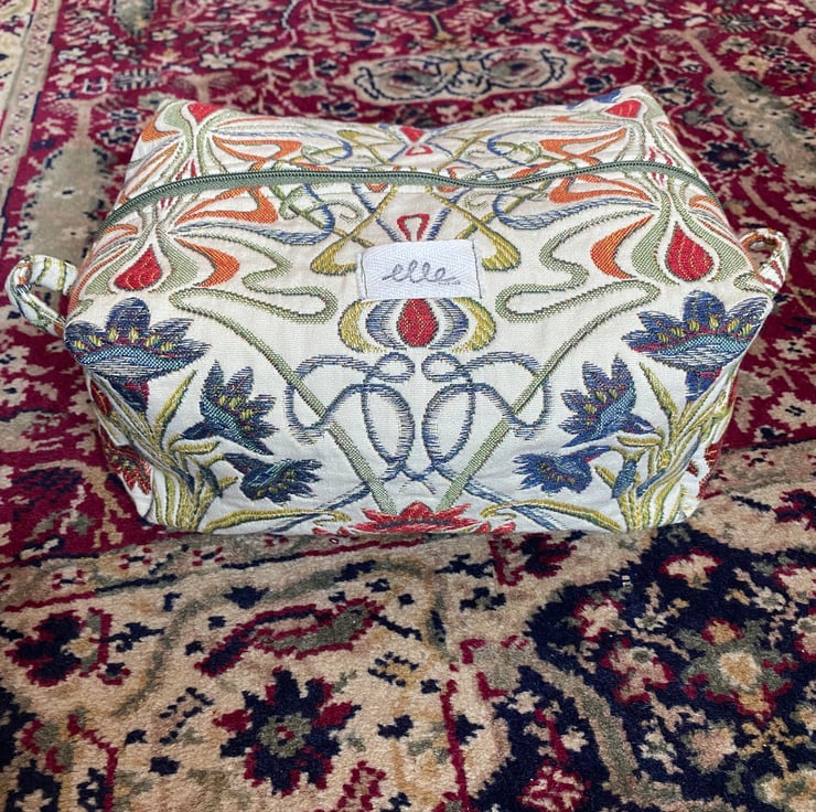 Beautiful Jacobean-style upholstery fabric on the outside, with mustard yellow cotton lining and green zip. Nice sturdy fabric allows for the bag to keep its shape when empty, but keep your bits and pieces protected when full!